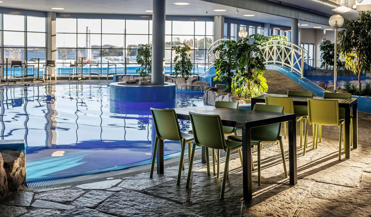 I Badeparken i Langesund kan du leke, bade, dykke og skli så mye du vil. Store bassenger snirkler seg rundt palmer og fossefall,det er sklier som får det til å kile i magen, og et utendørsbasseng med undervannsstrømmer og utsikt rett ut i havgapet. Inne finner du tre boblebad, fossefall, en gedigen sopp med sin egen foss, flere dyser og en stor vannsklie. Hotellet har en egen strandsone, og egen brygge med badstue ligger vakkert til ved sjøen.