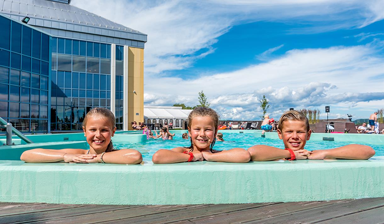 Store basseng, utendørsbasseng, strandsone og flytende badstue