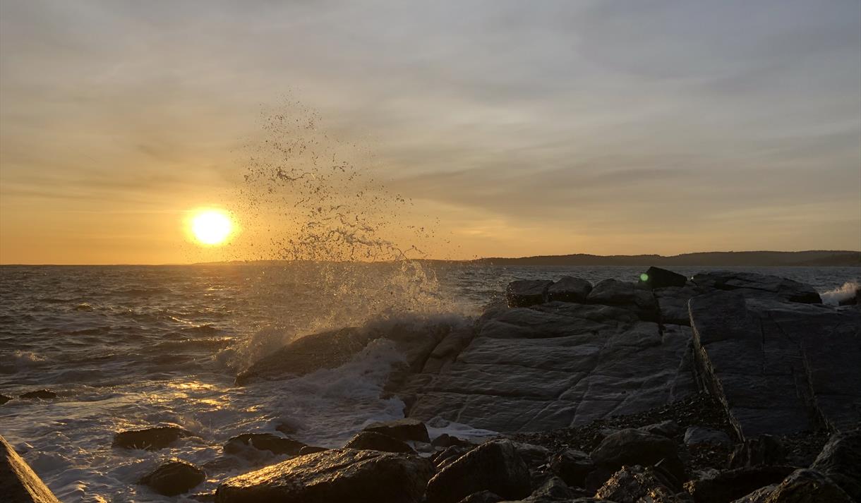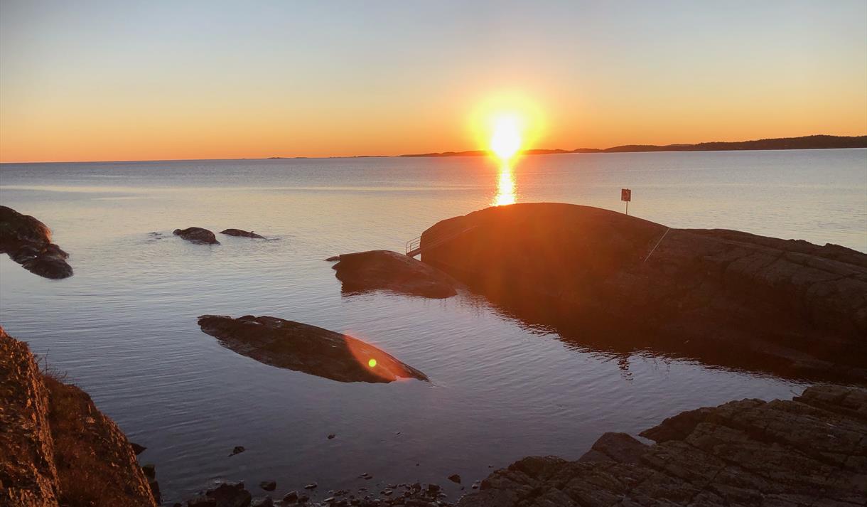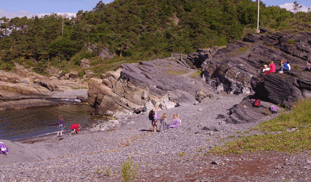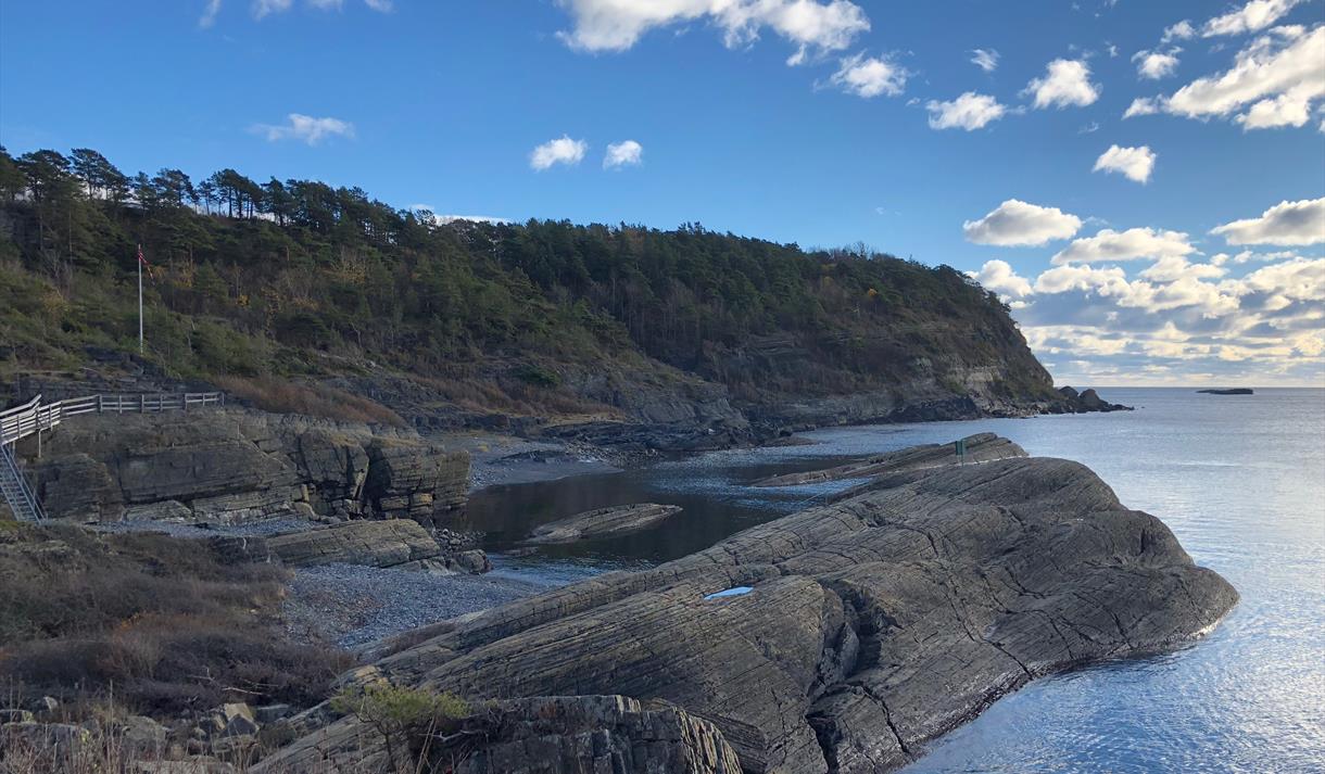 Det er skiltede stier som tar deg fra parkeringsplassen og ut på Langesundstangen. På sommeren er Steinvika et yndet badested.