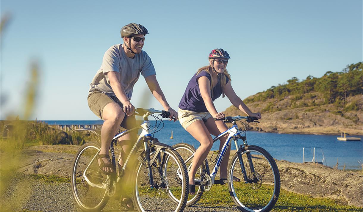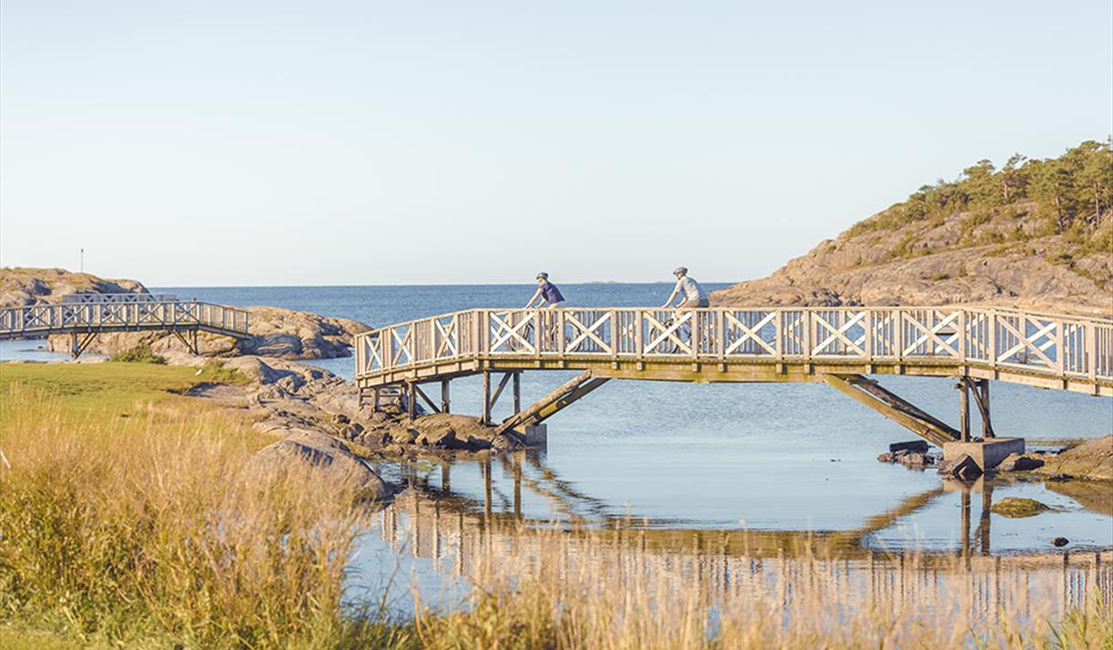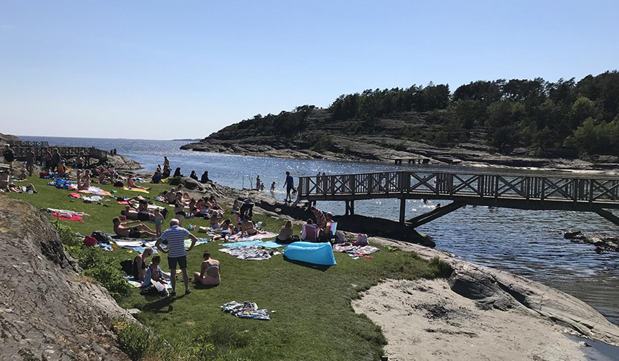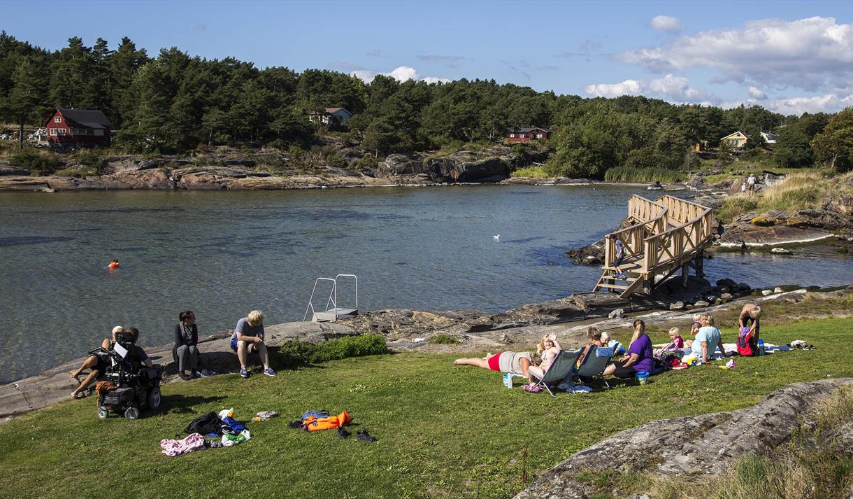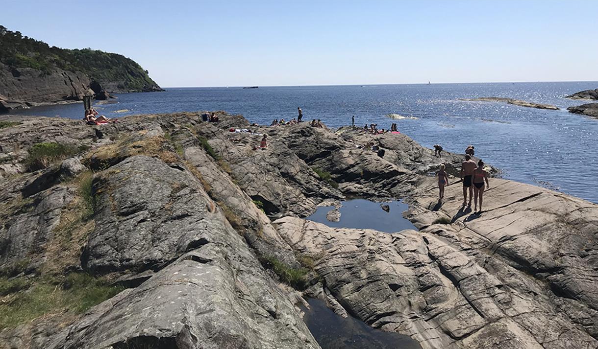 Dette er et fint sted for hele familien. Pent opparbeidet område med benker, gangbruer og badetrapper. Stor gressplen, langstrakte svaberg og flere sandstrender. Klart vann med hoppemuligheter både fra flytebrygge i vannet og svaberg. Langgrunne sandstrender.