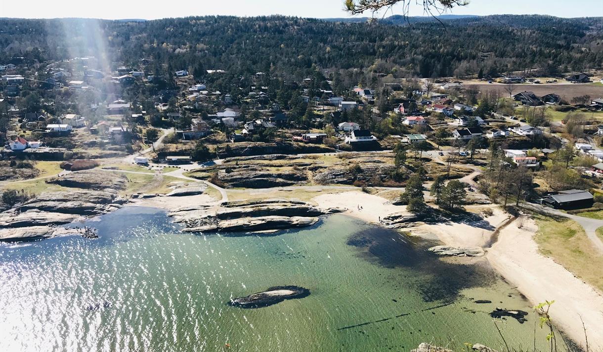 Herfra kan man også gå ned stien til Rognsstranda Camping og fortsette langs kysstien sørover til Åby og Valle.