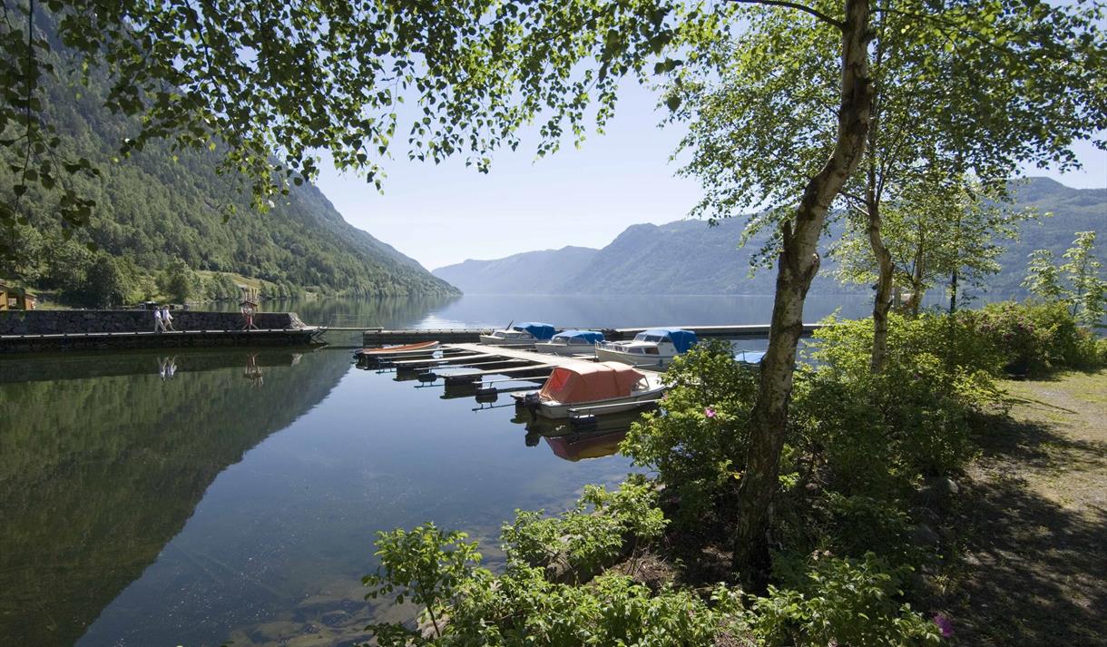 Ca. 10 plasser ved gjestebrygga. Drikkevatn, septiktømming, utsettingsrampe. Campingplasss med dusj/WC, hytteutleige og serveringsplass. Badestrand. Volleyballbane, naturstig og gode vandreturar. 300 m til ballbinge.
