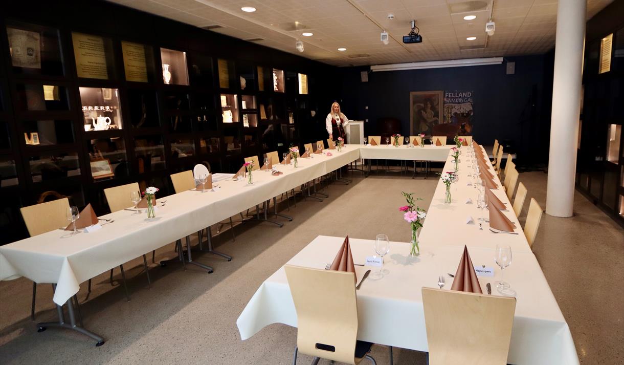 I kafeen har me småbord eller langbord alt etter kor mange som ynskjer å sitte saman. Me har god kapasitet, og kan ta imot grupper på opptil 100 personar. Me har gode lokale for møter, kurs, konferanser og selskap. Ta kontakt med oss for tilbod.