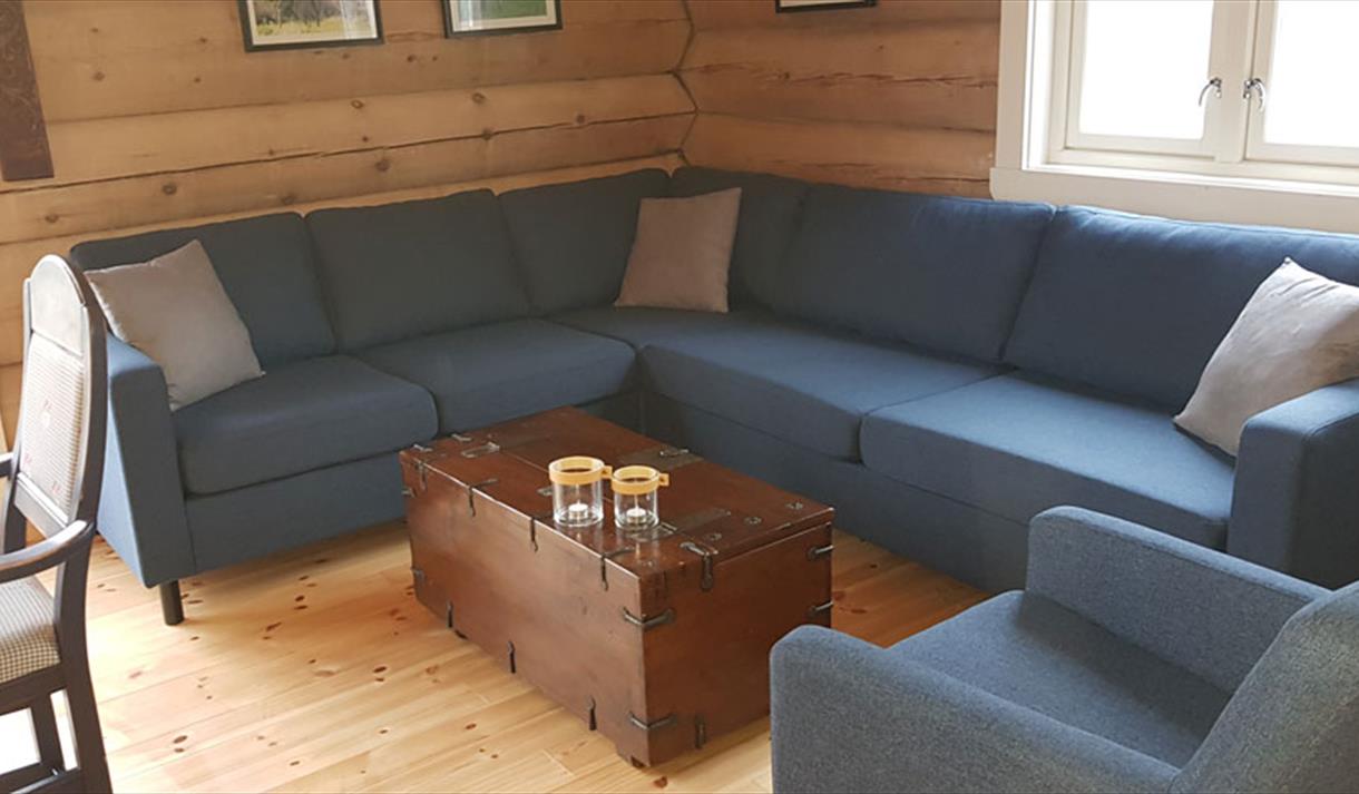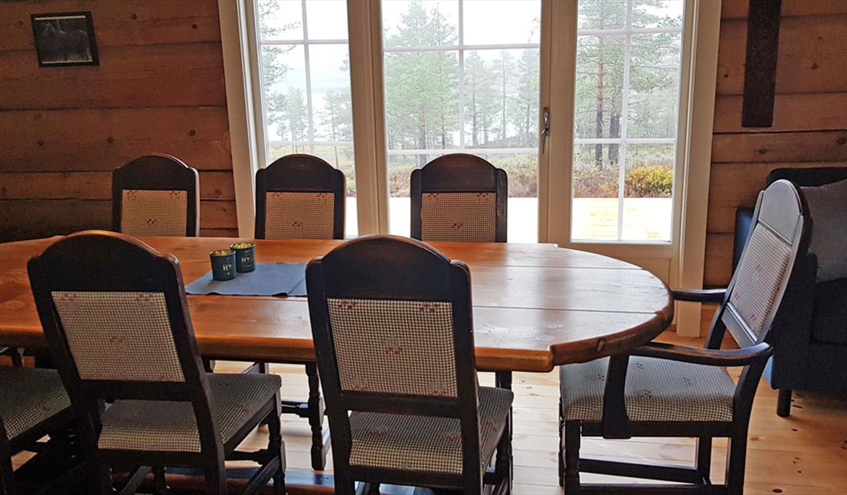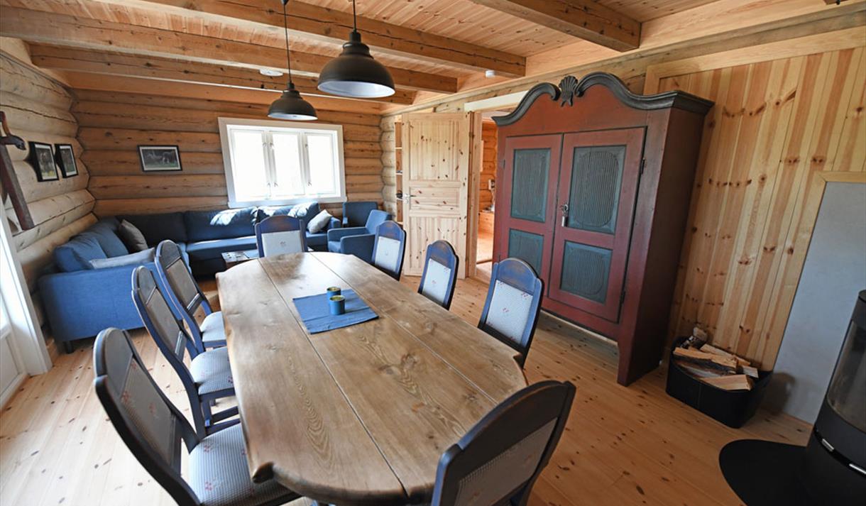 Hytta har 2 soverom med 2 køyesenger på hvert rom, hvorav den ene av køyesengene har dobbelt seng. I tillegg har hytta en koselig stue med langbord i bondestil, en god sofa, vedovn for oppvarming og en fin utsikt ned mot vannet fra stua.