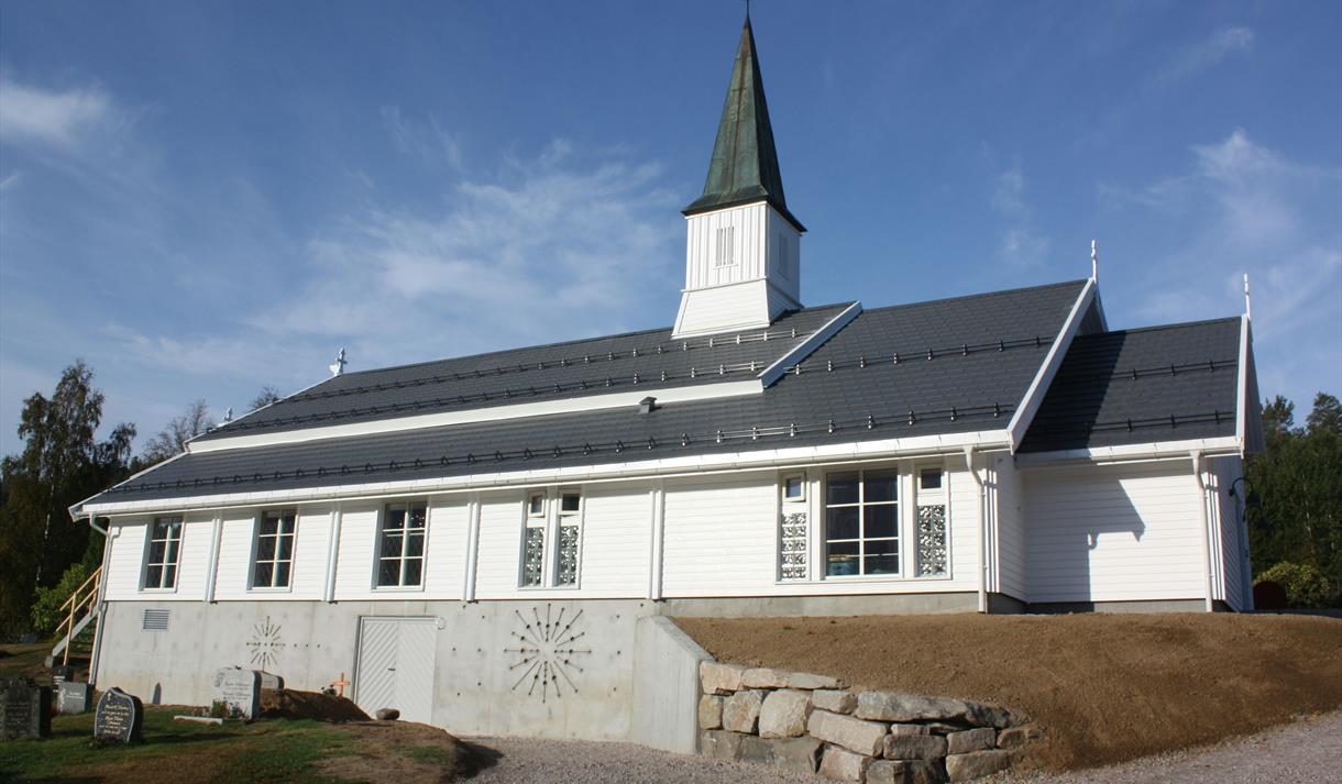 I sentrum i Drangedal ligger det en flott korskirke idyllisk til, med utsikt utover Toke