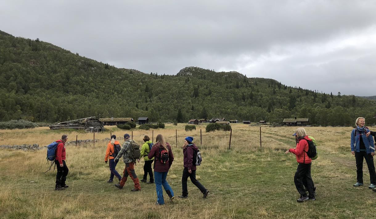Vi går til Hjerdalen og Fjøsbudalen og tar en god stopp i Sabotørhytta der det også blir tid til en matbit (husk å ta med mat og drikke).