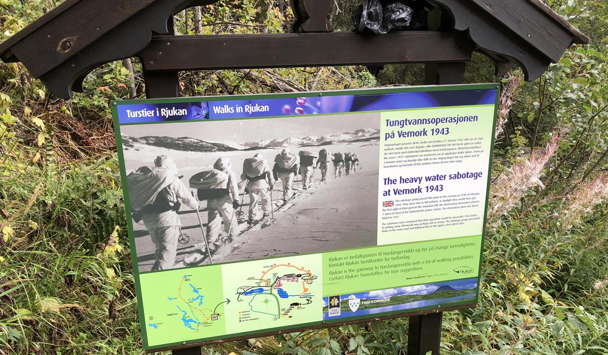 Sabotørstien er en 8 kilometer lang sti som ender ved Vemork kraftstasjon. Her går du den samme veien som sabotørene gikk for å gjennomføre en av de viktigste aksjonene under andre verdenskrig.