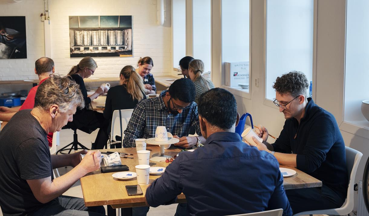 Velkommen til å prøve deg som stråmaler. Mal ditt eget krus eller tallerken i blått og hvitt!
