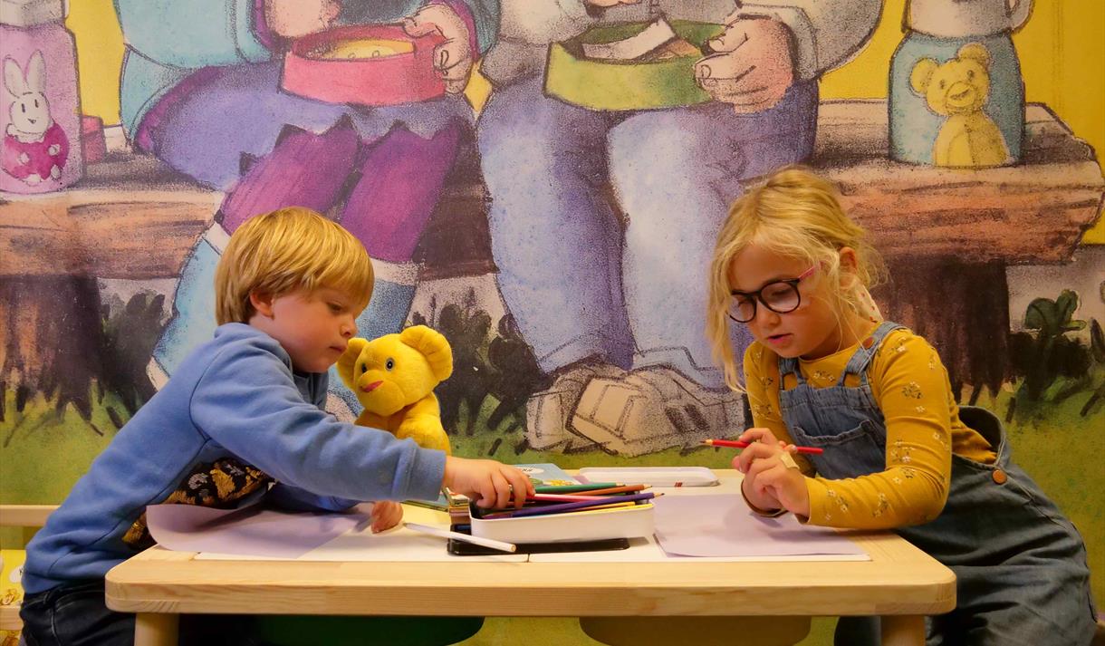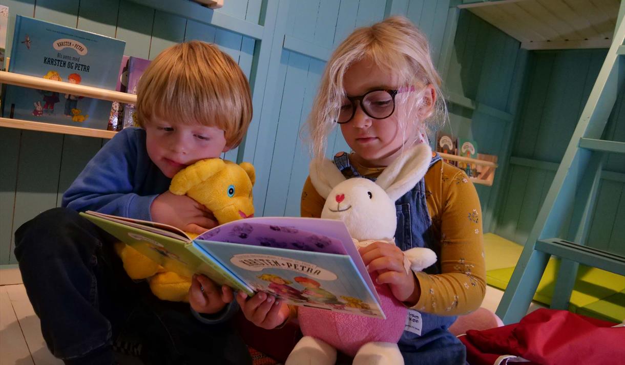 Dette er ingen tradisjonell utstilling, men et sted der barna kan leke i Duestien barnehage, lese Karsten og Petra-bøker, tegne og bygge teppehytter.