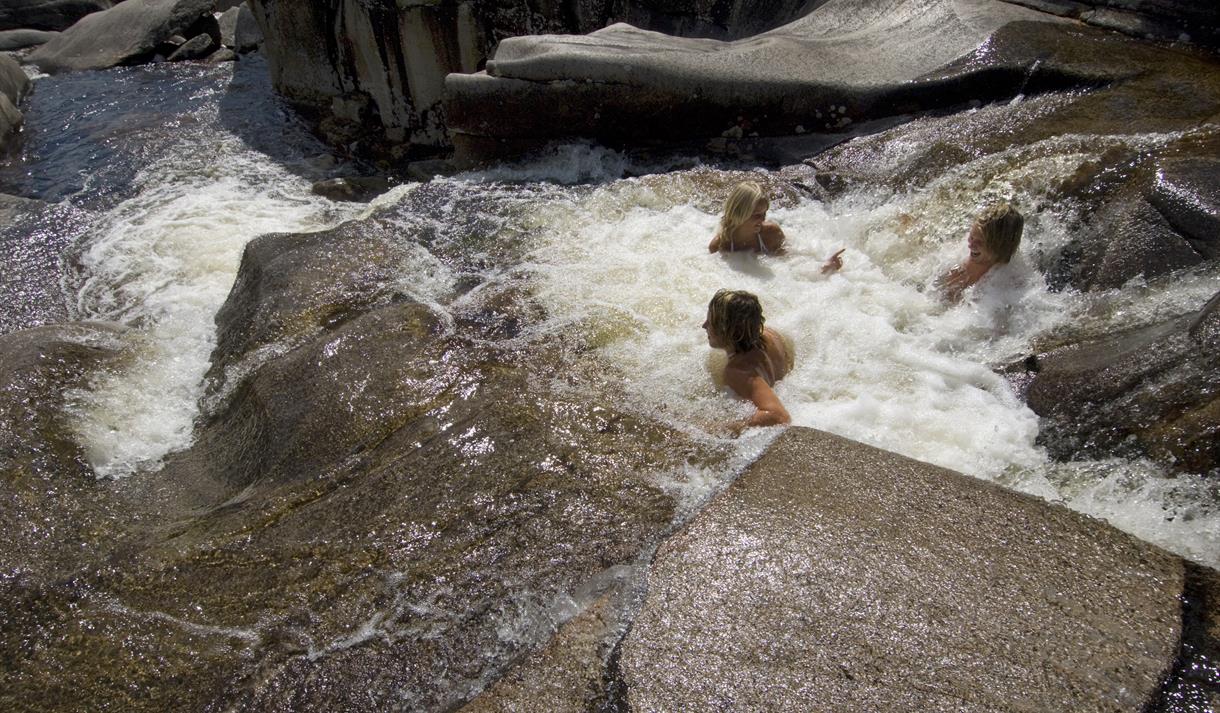 Jettegrytene sør i Nissedal er naturens eget badeland. Her ligger jettegryter på rekke og…