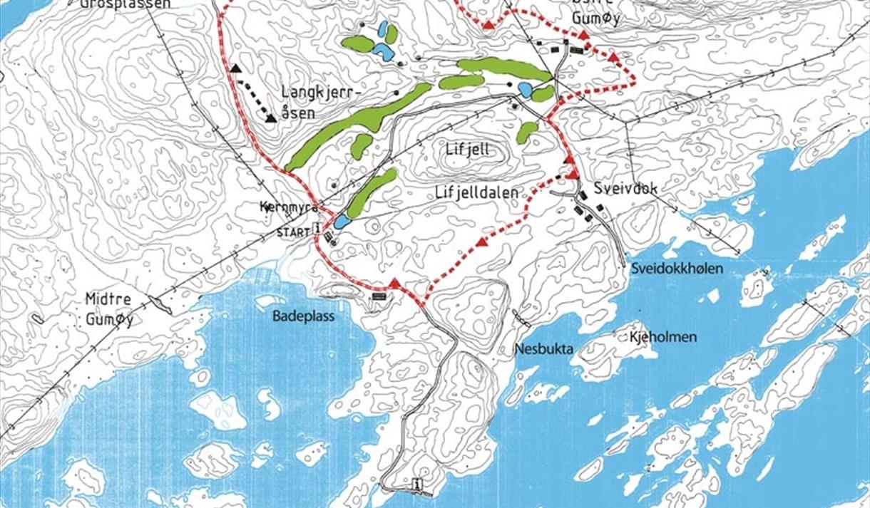 Med gode sko og kikkert kommer du altså veldig langt, men skulle du likevel ønske deg et kart så er det laget et kart med turstier, informasjon og lokalhistorie. Dette er å få kjøpt for 100kr på Vestre Gumøyknute/Signalen eller hos Ballestad og Isnes som bor på Gumøy. Du kan også få kartet tilsendt på forhånd ved å kontakte Gumøy Velforening. I tillegg kan du finne kart over Gumøy på Norgeskart og MTBmap.