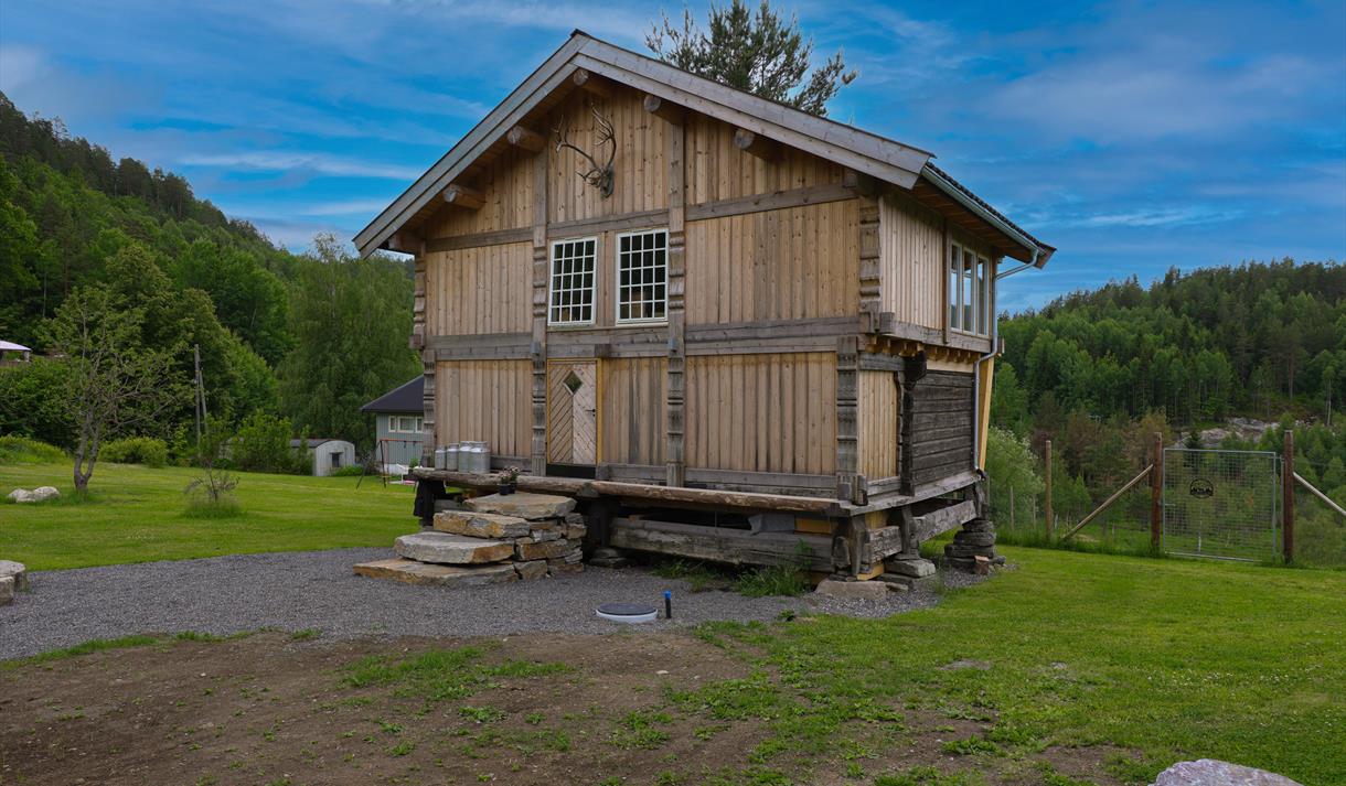 På garden har me også eit stort og flott stabbur som me leiger ut til overnatting. Her er det to gode soverom nede, med 200 år gamle veggar, og eit stort og luftig opphaldsrom med flott utsikt oppe.