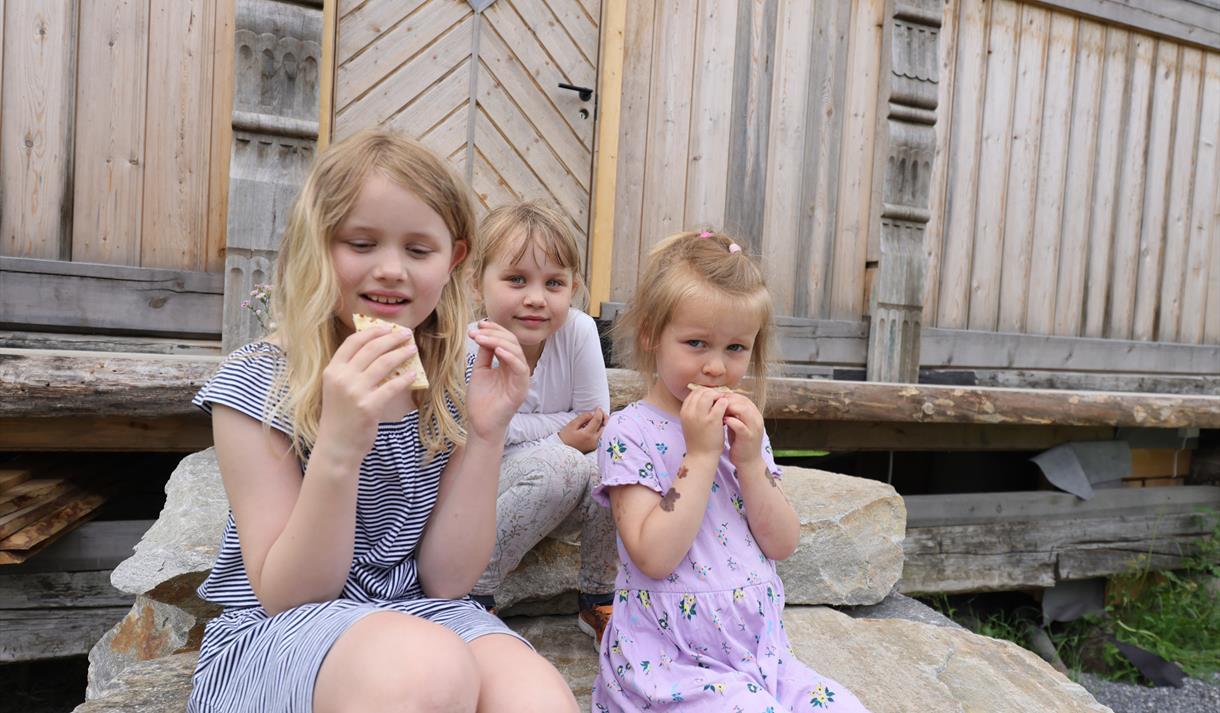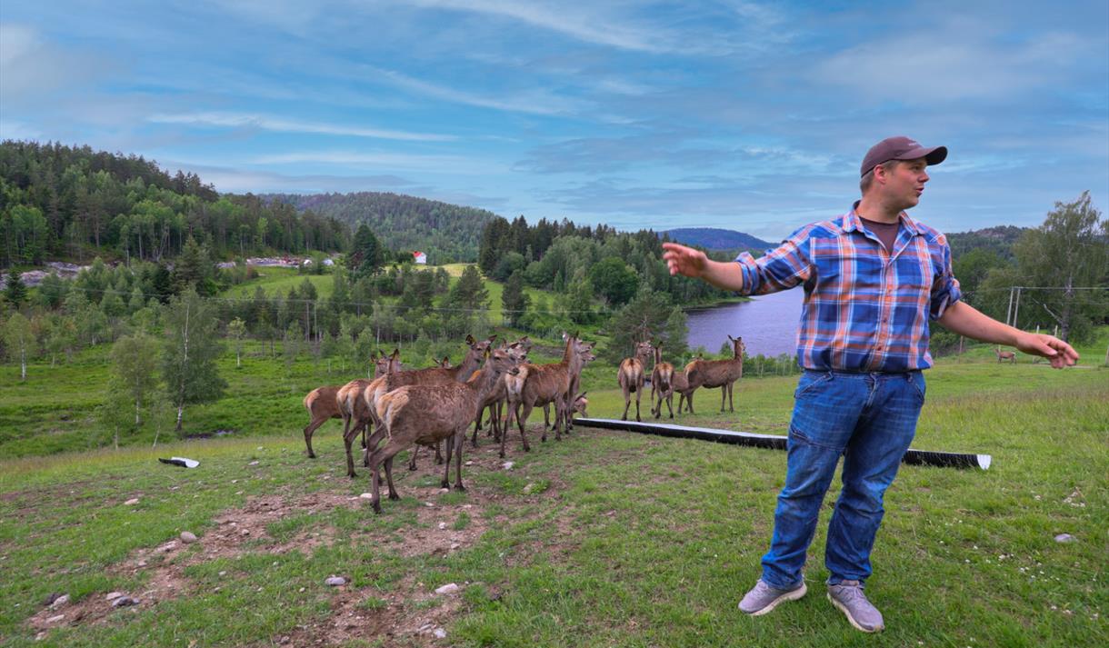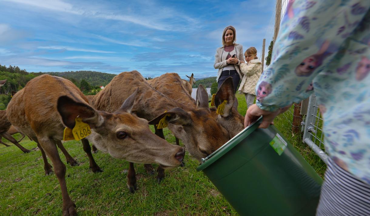 Ute finn du ei bålpanne med sitteplassar rundt, og eit leikestativ med sklie. Kaffien kan du nyte på stabburstrappa eller i steinstolane medan du ser hjortane tusle omkring på jordet. Det er rundt 20 vaksne dyr i hjortehegnet, og frå midten av juni kvart år kjem dei søte kalvane som går på beite saman med mødrene sine.