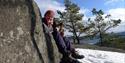 På toppen av den gamle kjerreveien viser et skilt opp til en liten kolle. På benken her kan du nyte utsikten over Hellefjorden.