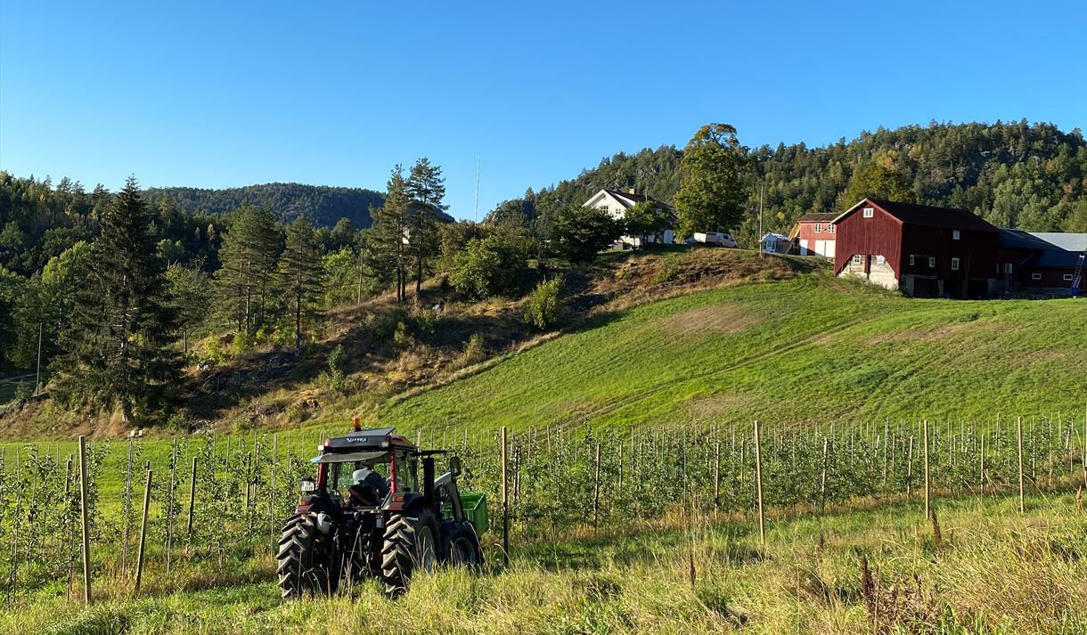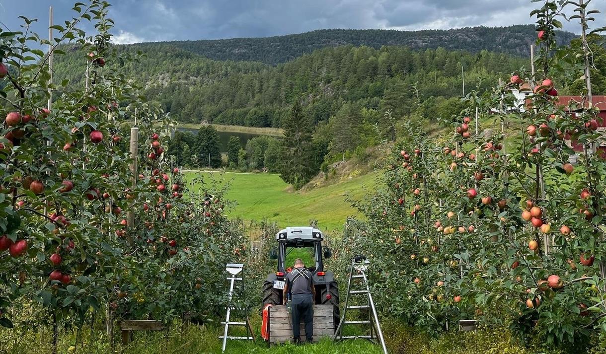 Eplehagen har to sorter per dags dato - Julyred og Gravenstein. Disse sendes til konsum i butikk, og presses til Kragerømost.