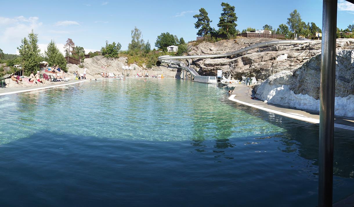Anlegget består av et hovedbasseng og et lite barnebasseng, vannet er klor-holding sjøvann som blir oppvarmet til 26º grader. I bassenget finnes det også en rutsjebane samt to vannpolomål. Bassenget er sprengt inn i fjellet, dette gjør at anlegget ligger i ett med naturen og ikke er synlig for utenforstående. Bassenget åpner vanligvis rundt St.hans.
