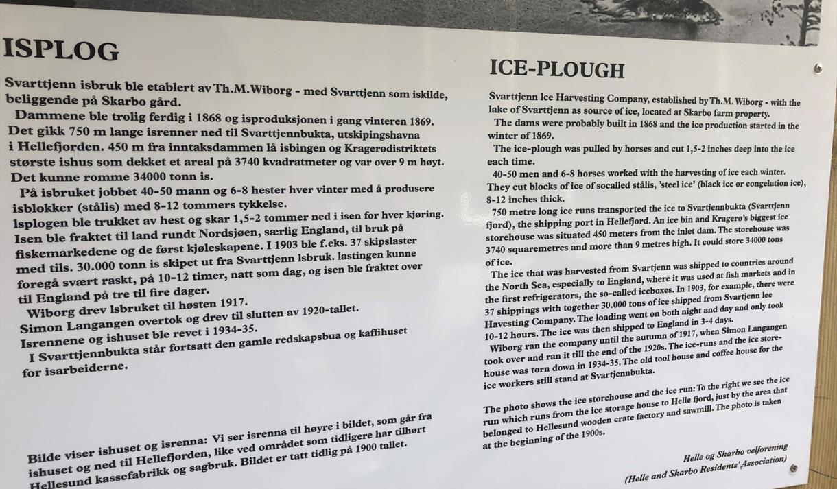 Helle ligger ved Hellefjorden ca. 7 km fra Kragerø sentrum. Opprinnelig var Helle et lite industrisamfunn, men i 1930 ble Helle Bruk avviklet etter 350 år med sagbruk virksomhet. Helle var også kjent for sin produksjon av naturis, hvor stedet på et tidspunkt hadde tre store isbruk. Fra Skarbo Kultursenter, den gamle Skarbo skole, går det sti opp til Svarttjenn, her kan du se rester etter fundamentene til isrenna som gikk fra Svarttjenn (Turen tar cirka 25 minutter). Et lite utendørsmuseum viser gamle gjenstander og du kan lese og lære mer om den spennende historien til «Svarttjenn isbruk». Kanskje det var nettop her at det lå Norges største ishus?