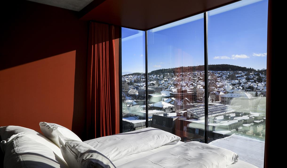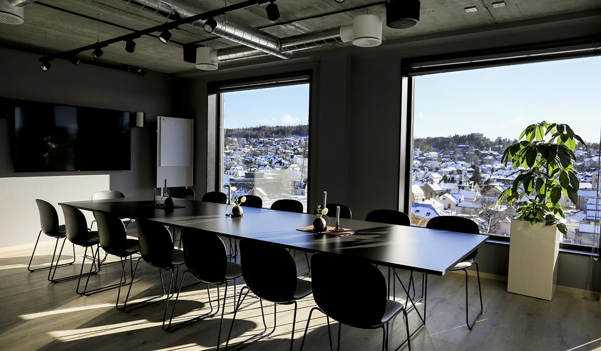 1 møte- og selskapsrom i toppetasjen, Porsgrunn View, med panorama utsikt over Porsgrunn by, og med tilgang til terrasse. Sitteplasser i styrebordsoppsett til 16 personer, og plass til ca 30 personer i minglekonsept. Rommet kan åpnes inn til toppsuiten og et tilknytningsrom via en connecting door for større kapasitet totalt sett. Tv-skjerm for presentasjoner eller annen type fremvisning.