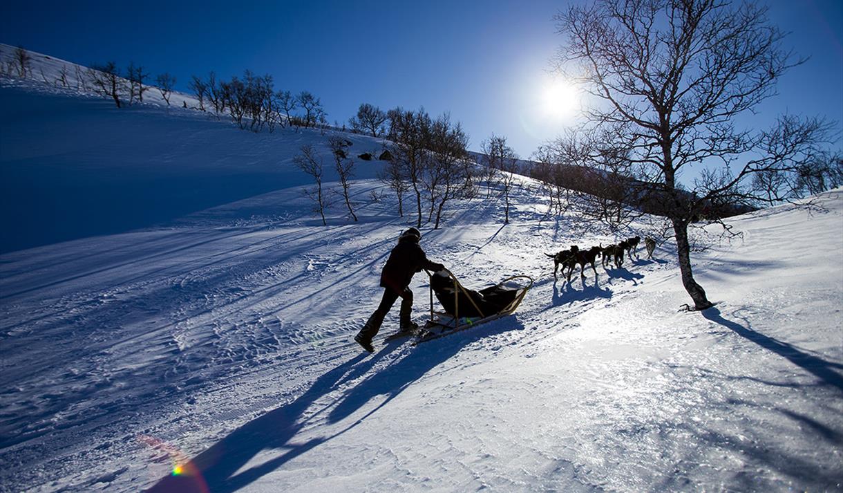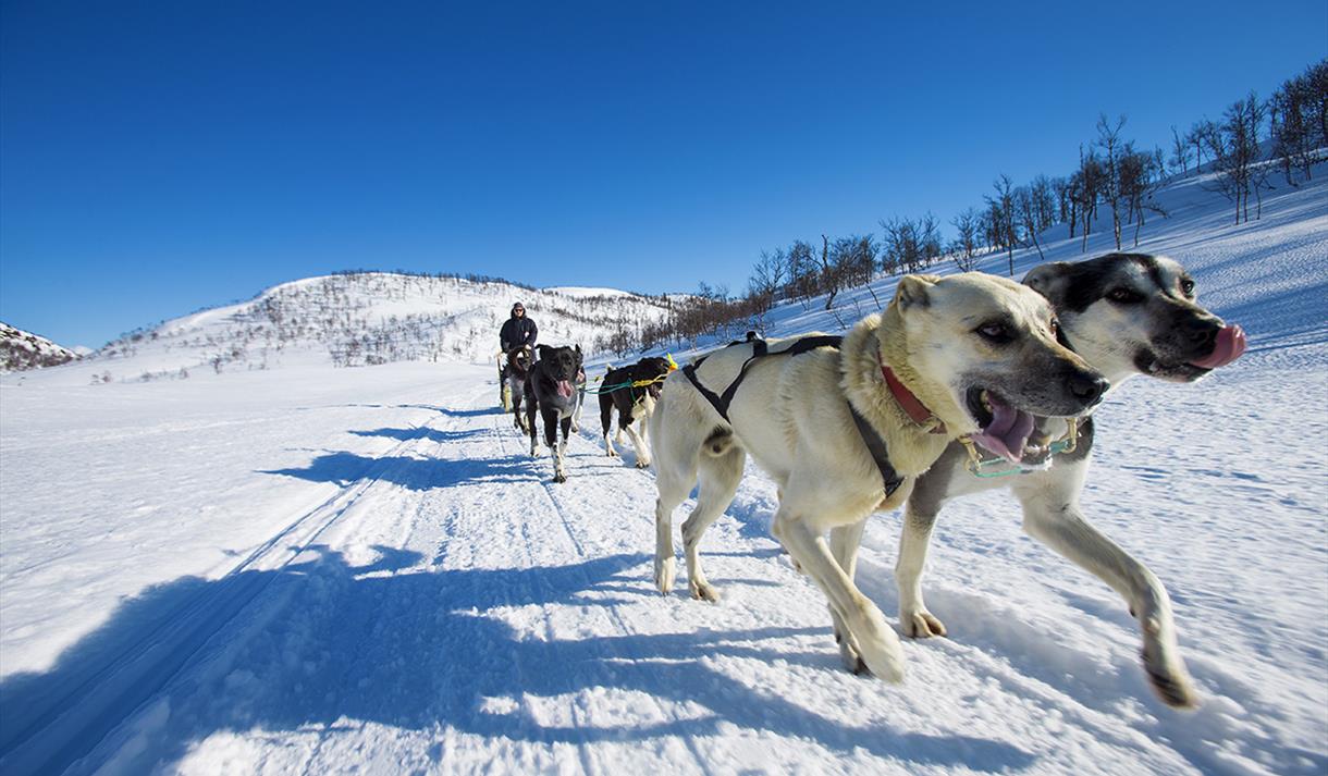 Du trenger ingen erfaring for å bli med på hundekjøring hos oss. Våre profesjonelle guider gir deg grundig opplæring før turen starter. Hundespannet følger trygt etter guiden som kjører først, slik at du kan nyte følelsen av å gli lydløst gjennom landskapet, kun akkompagnert av vinden og ivrige poter mot snøen.