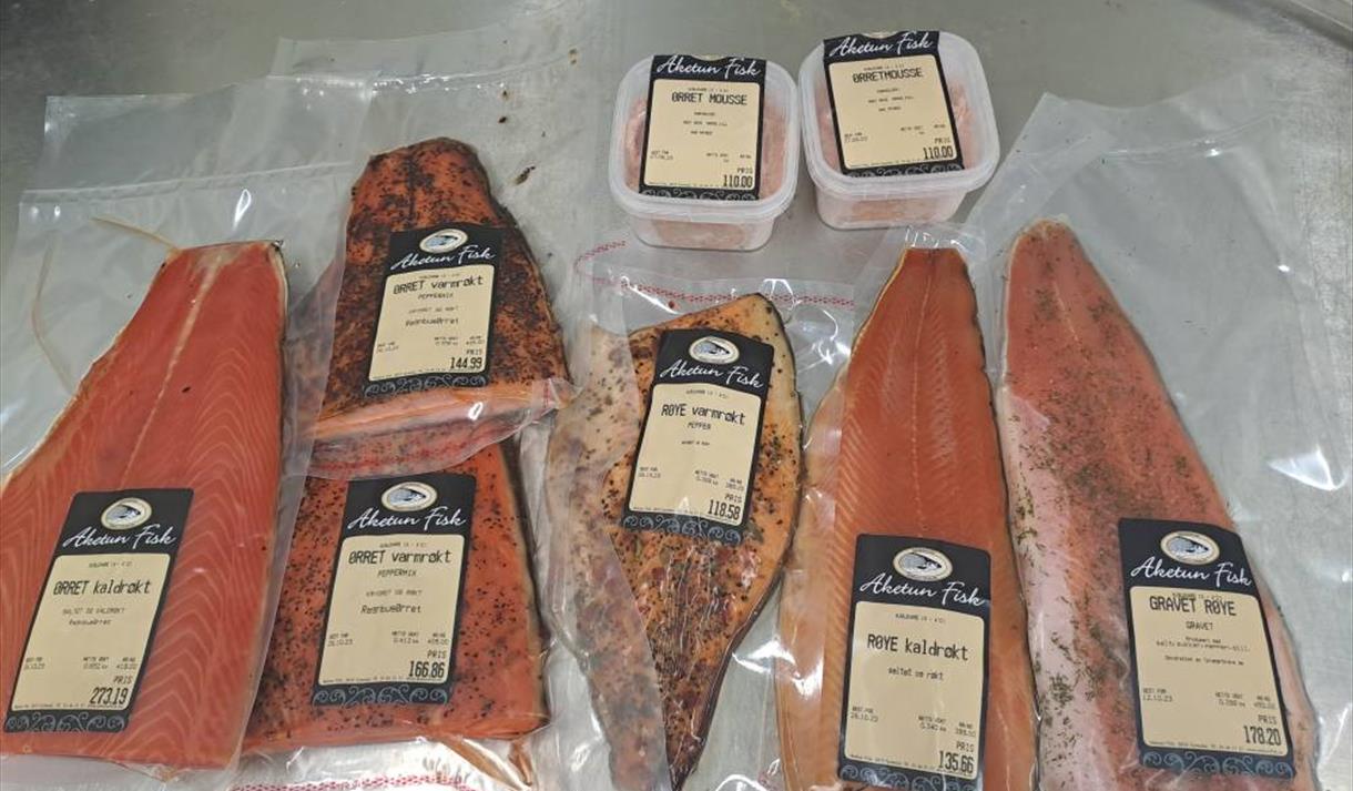Foredlede fiskeprodukter: Varm og kaldrøkt ørret og røye. Gravet ørret og røye, Fiskekaker. Ørretmousse. Fersk røye