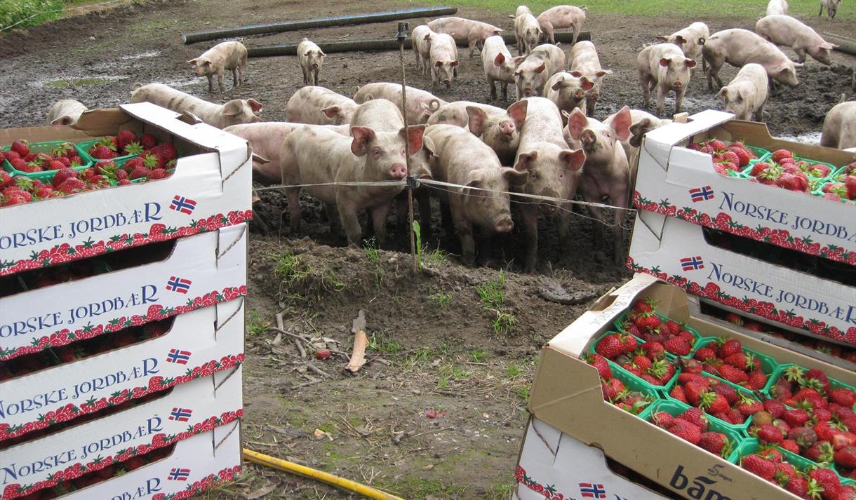 Jordbær 1 måned fra St. Hans og svinekjøtt på bestilling.