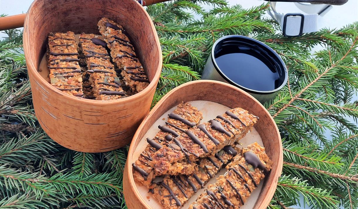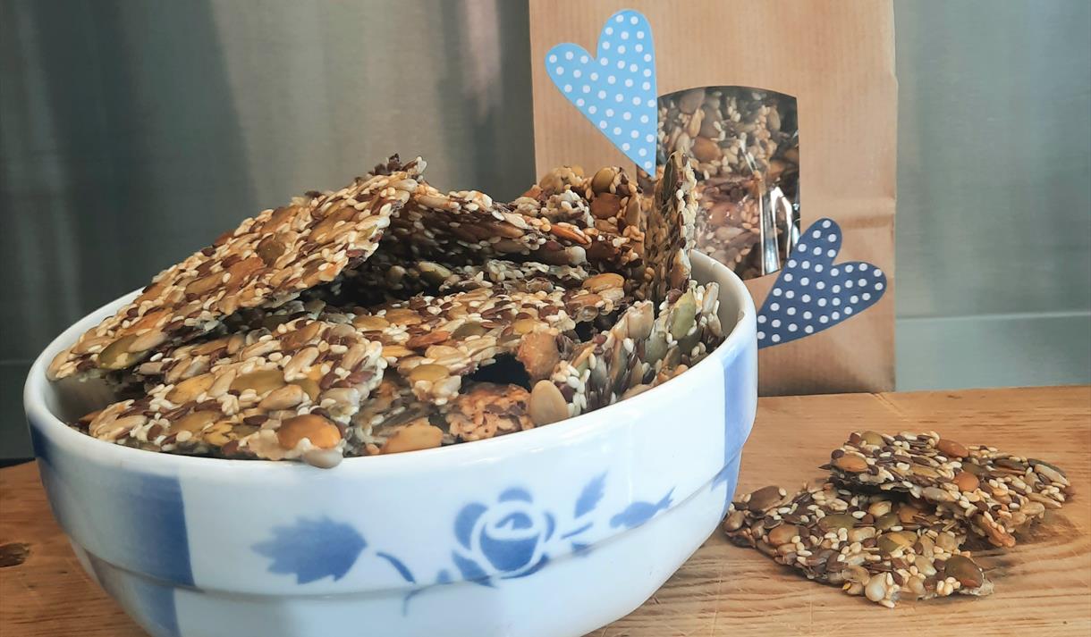 Proteinrike bakarvarer baserte på frø, nøtter og eggekvite frå eigne høner: Brød, kjeks, snacks og energibarar. Marengs, kokosmakronar, kokosbollar og diverse jolebakst.