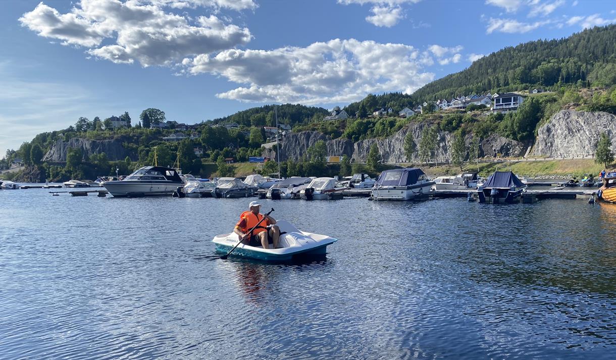 Vil du eller andre i familien ta det litt roligere? Da kan dere prøve vår populære tråkkebåt, med plass til 4 stk. Innerst i bukta kan dere tråkke trygt rundt.