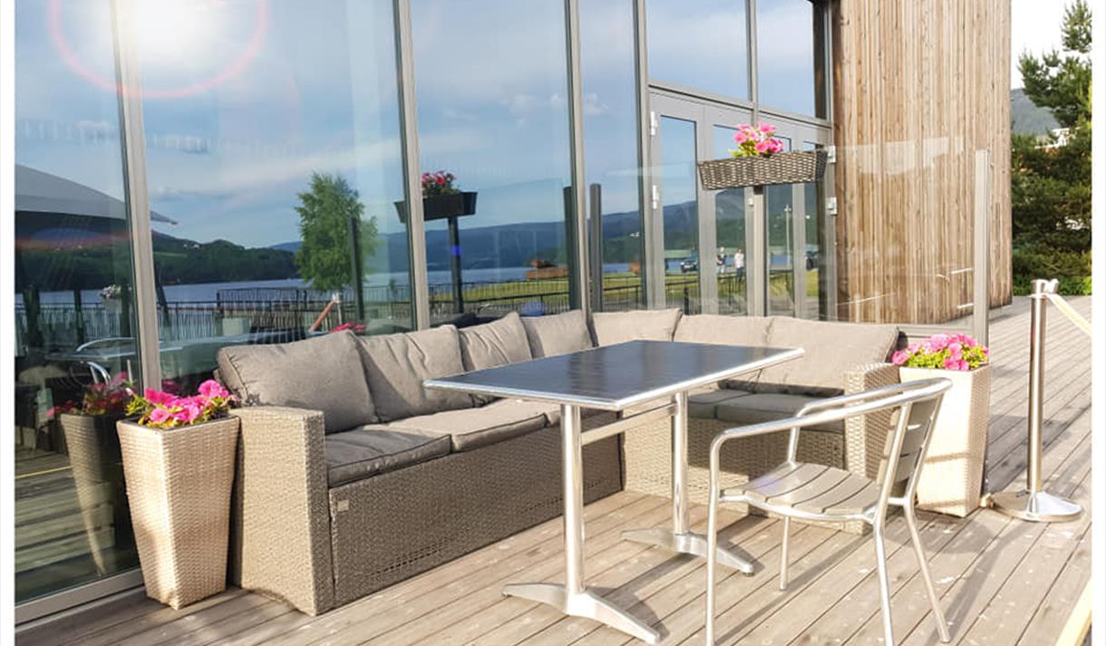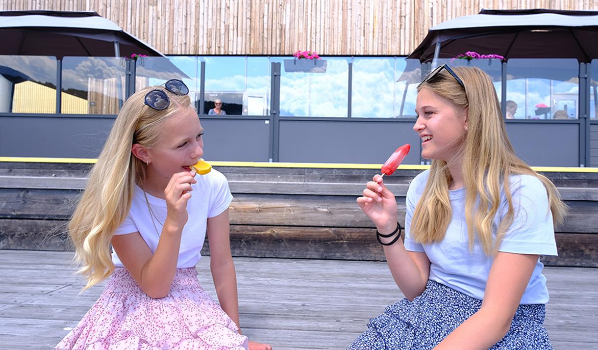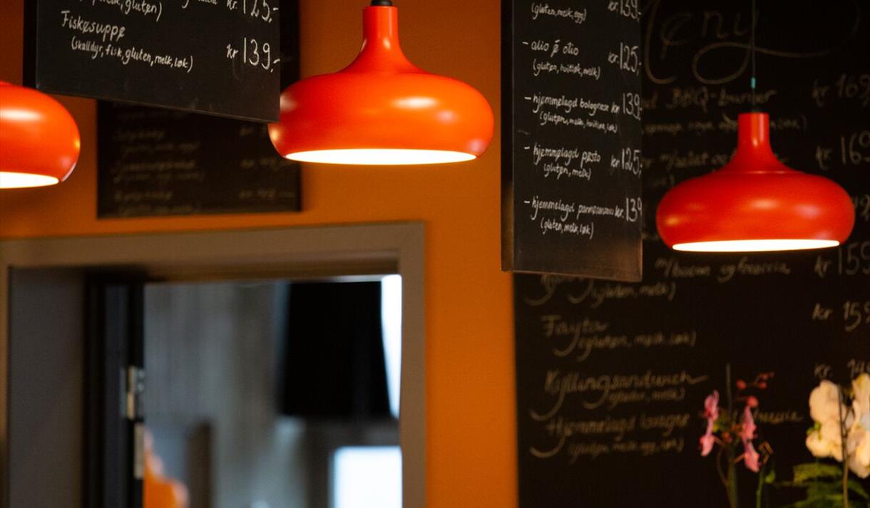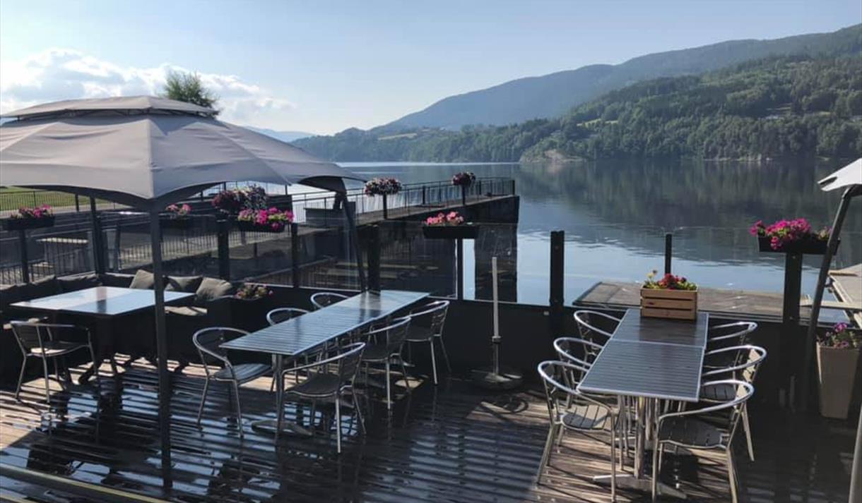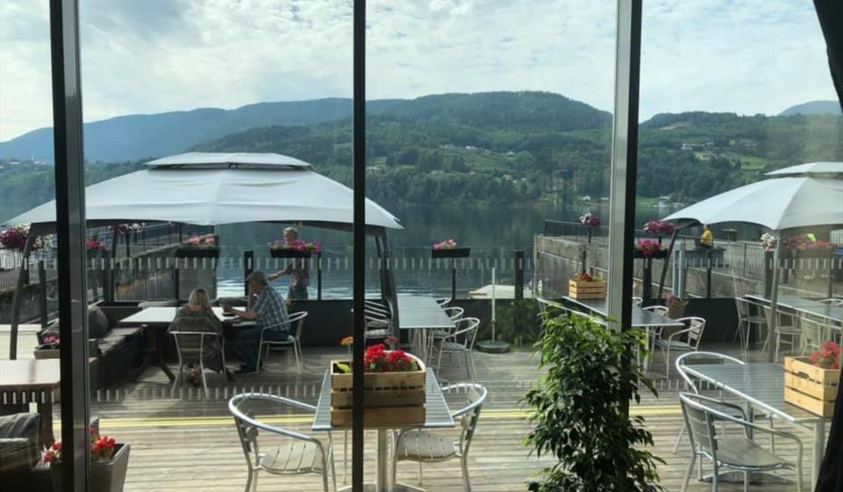 Dany's Café i Bok & Blueshuset tilbyr varme og kalde retter. Her finnes en flott uteservering rett ved kanten