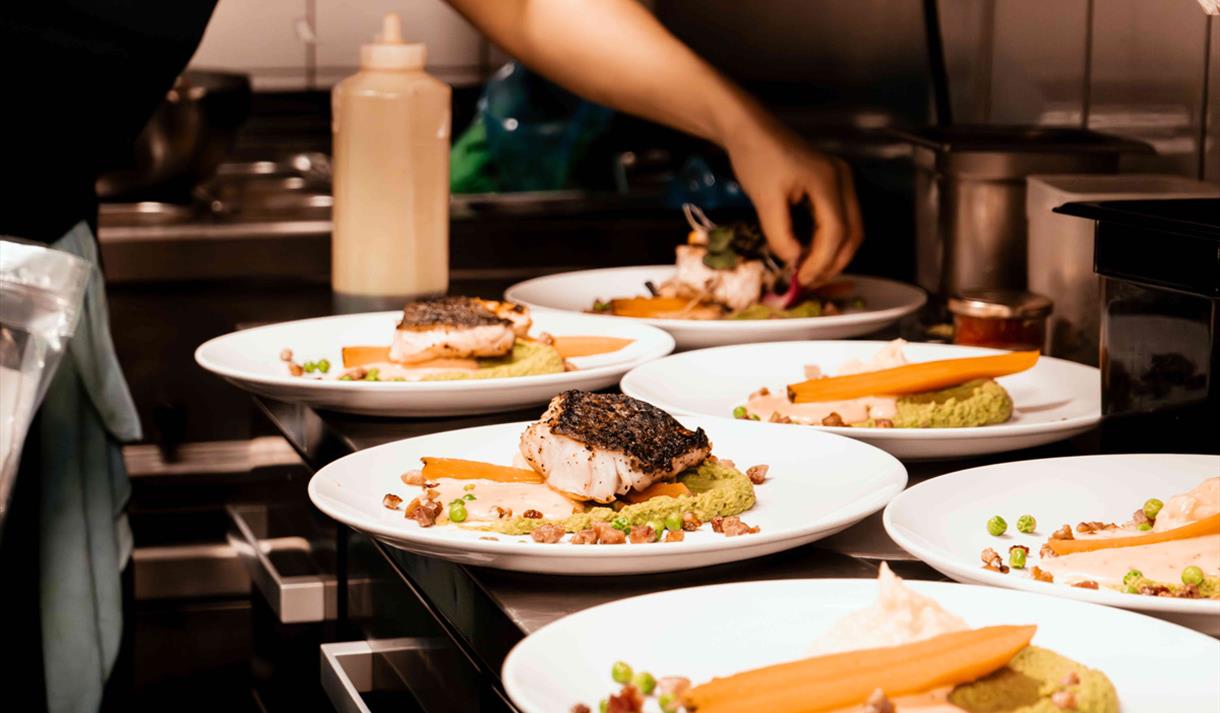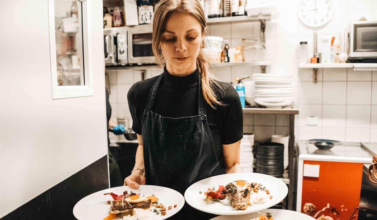 På ettermiddagen og kvelden kan du nyte en rikholdig meny med fokus på hjemmelagede retter og lokale råvarer. Baren er åpen hver dag og holder det gående helt til stengetid.