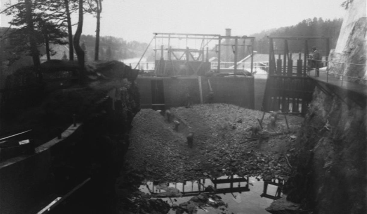 Tømmerrenna som går over Tinfosområdet, har frakta tømmer forbi fossene der det ble bygd…