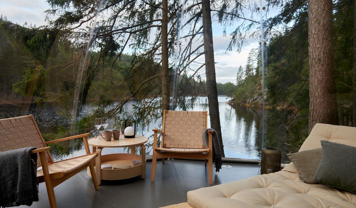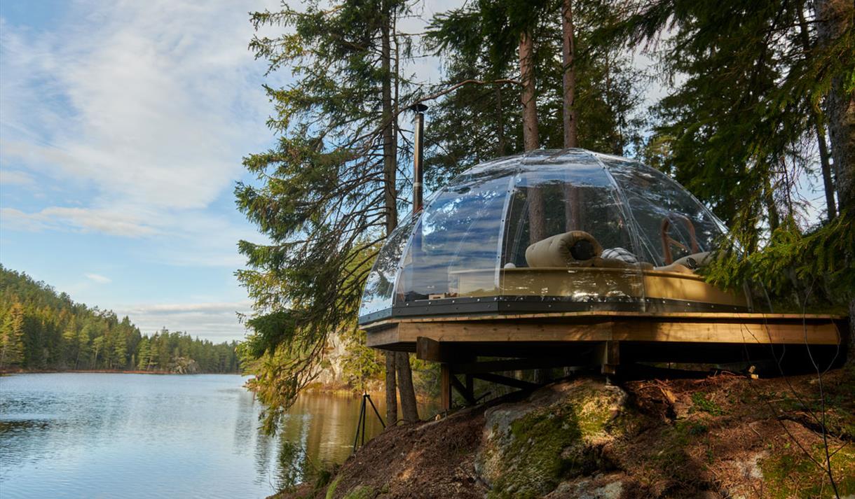 Etter en kort rusletur på bare 3–4 minutter fra parkeringen er du fremme ved igloen. Den er plassert på en naturlig liten høyde, et par meter over vannet, og gir deg en spektakulær følelse av å sveve over tjernet. Du er omslynget av høye trekroner i et kupert, fredelig terreng.