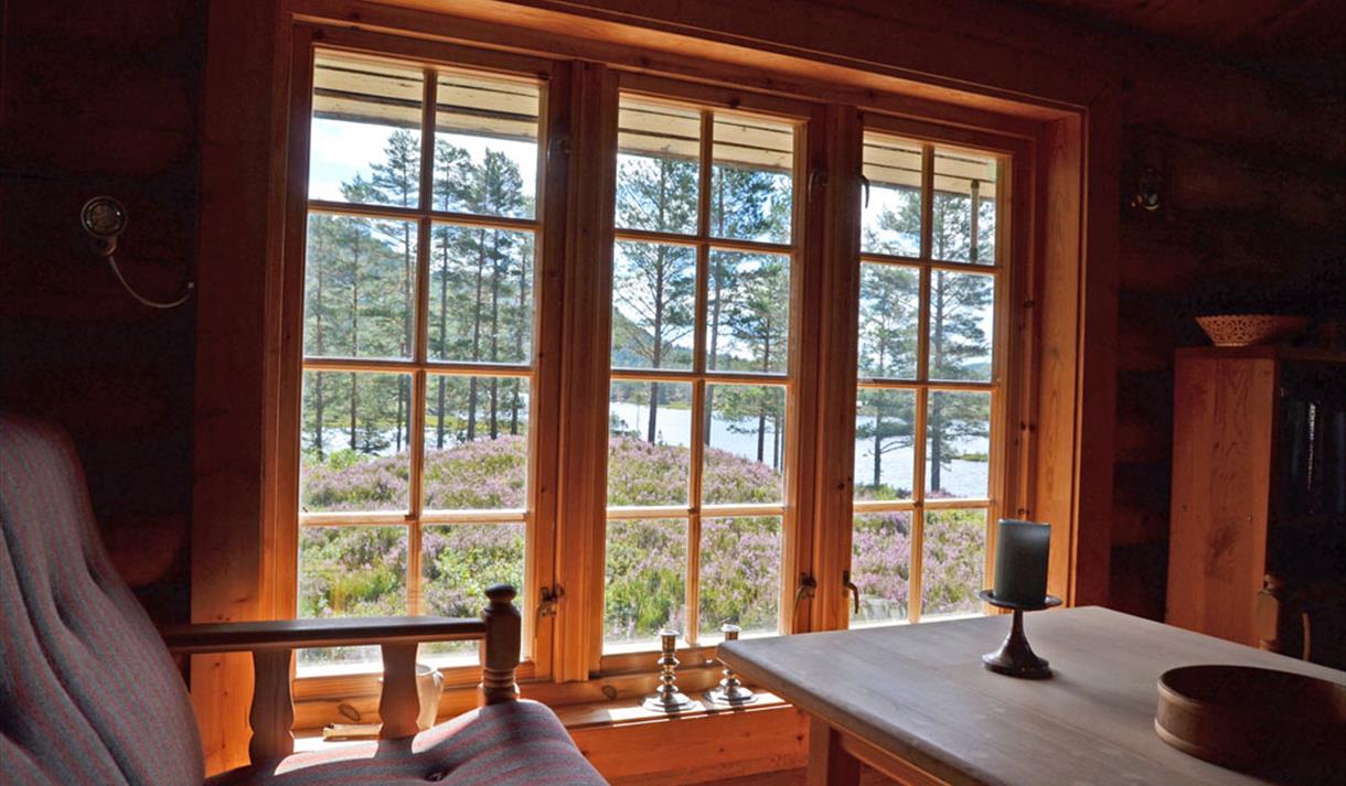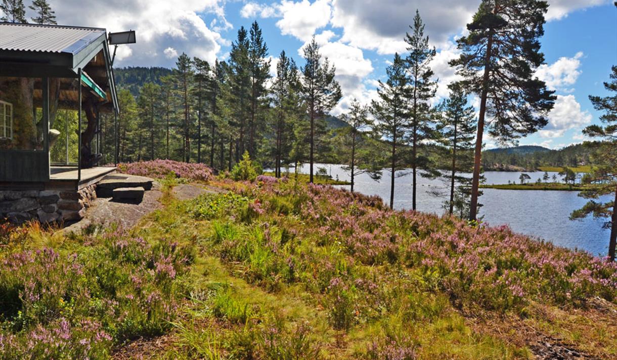 Utenfor hytta er det en fin veranda med tak med panorama utsikt over Sandvann.