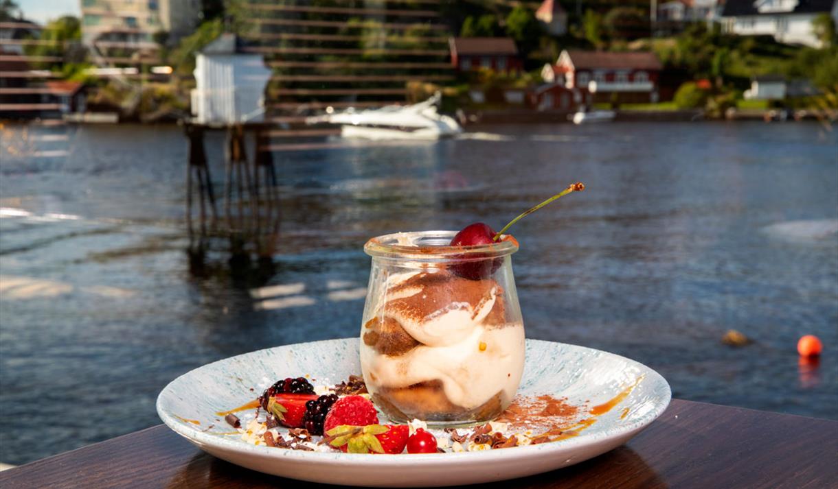 På Øya får du byens beste elveutsikt. Lunt og koselig inne på kalde dager, og med en meget attraktiv uteservering om sommeren.