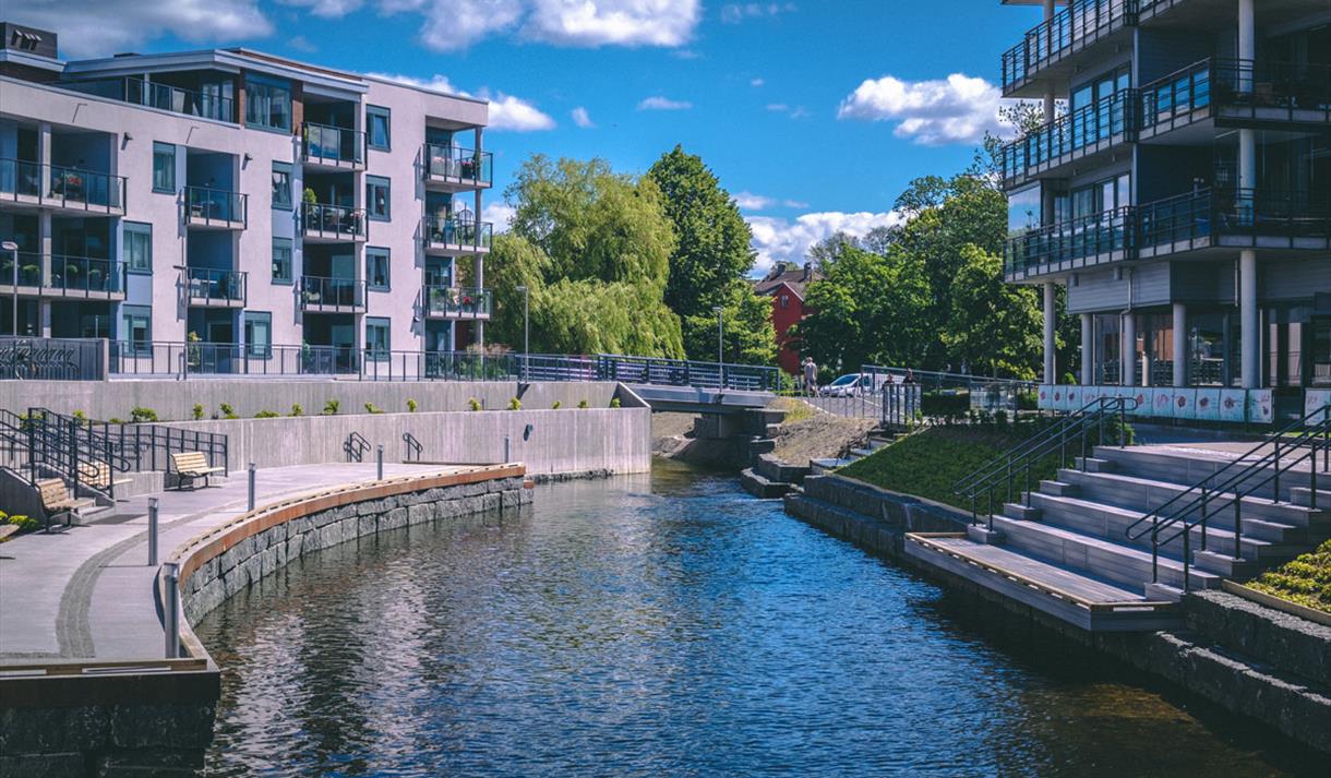 Det første du møter er bydelen Bratsberg Brygge, et spennende, nytt boområde. Her er det skapt et levende bryggemiljø med forretninger på fortausnivå og flotte utearealer langs kanalene.