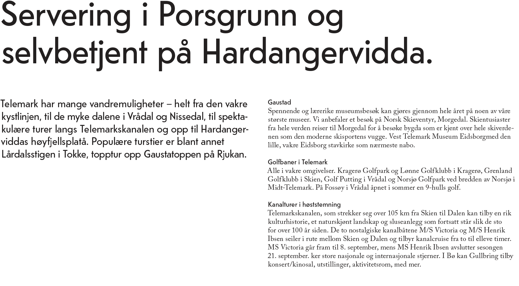 Telemark byr på et mangfold som kan være vanskelig å kommunisere uten å bli utydelig som «alt for alle». Kontraster er en måte å utnytte mangfoldet på, på en måte som gir store muligheter innenfor ulike næringer til å forsterke sine bud- skap ved å sette egne produkter sammen med noe annet som forsterker kundens opplevelse av det som settes i kontrast mot hverandre.