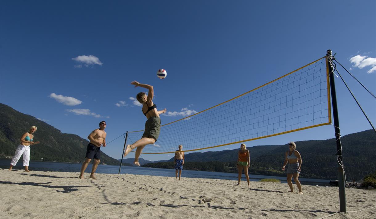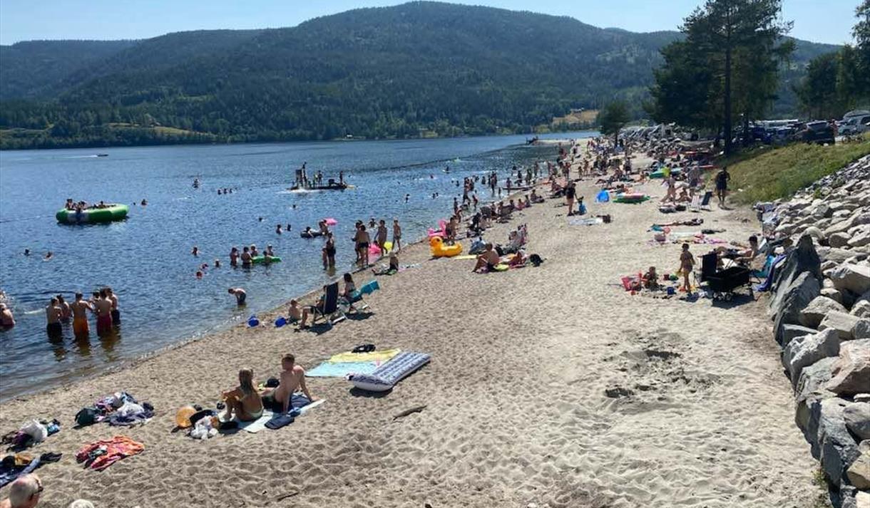 Enten du vil ta ein forfriskande morgondukkert eller bruke heile dagen ved vatnet, er dette staden for avslapping og naturglede. Stranda er lett tilgjengeleg frå campingområdet og ligg i eit lunt og roleg område med utsikt mot skogkledde åsar og fjell.