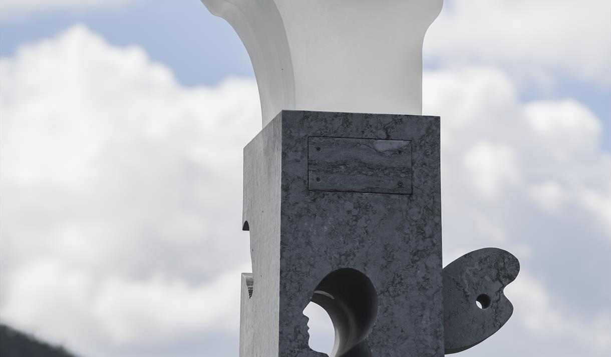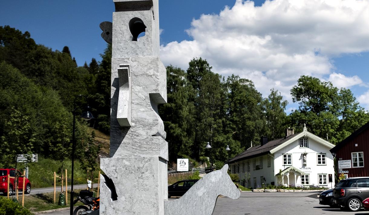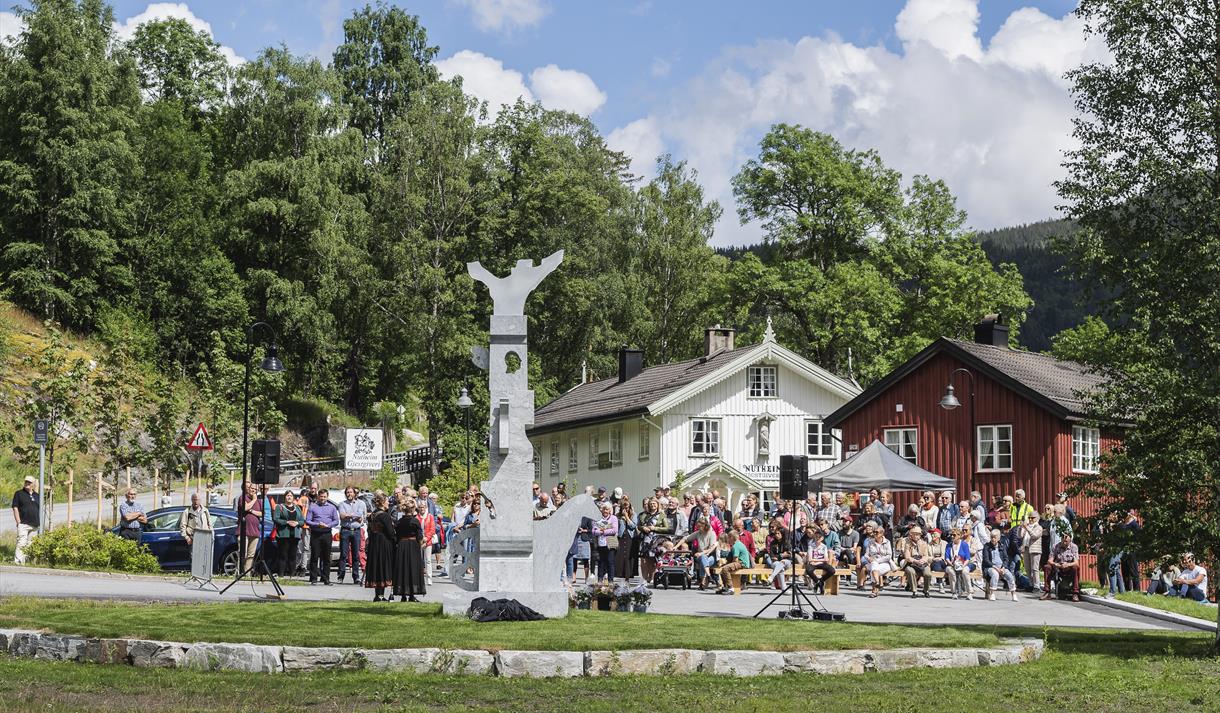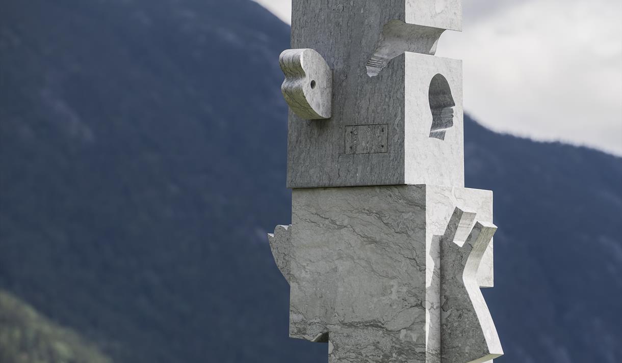 På grøntområdet ved parkeringsplassen på Nutheim har Philipp Dommen sin skulptur «Nutheim totem» fått ein sentral plass. Skulpturen er godt synleg for bilistar og reisande som fer framom, i vegkrysset mot Åmotsdal og for dei som oppheld seg på Nutheim.
