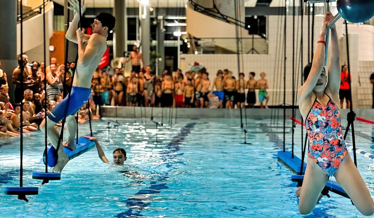 Idrettsbassenget er 25 meter langt og har seks banedeler, mens stupebassenget er 4.5 meter dypt og har fire høyder på stupetårn, hvor det høyeste er 7.5 meter. Her finner du også en 3 meter høy klatrevegg hvor vannet er din landingsplass.