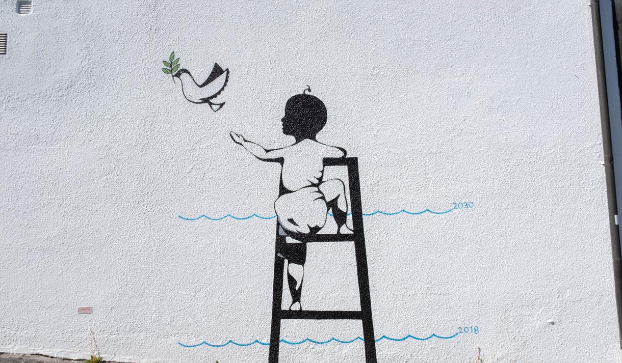 Et enkelt motiv med budskap om å verne om freden og vår natur, og med en antydning om mulig vannstand i 2030.