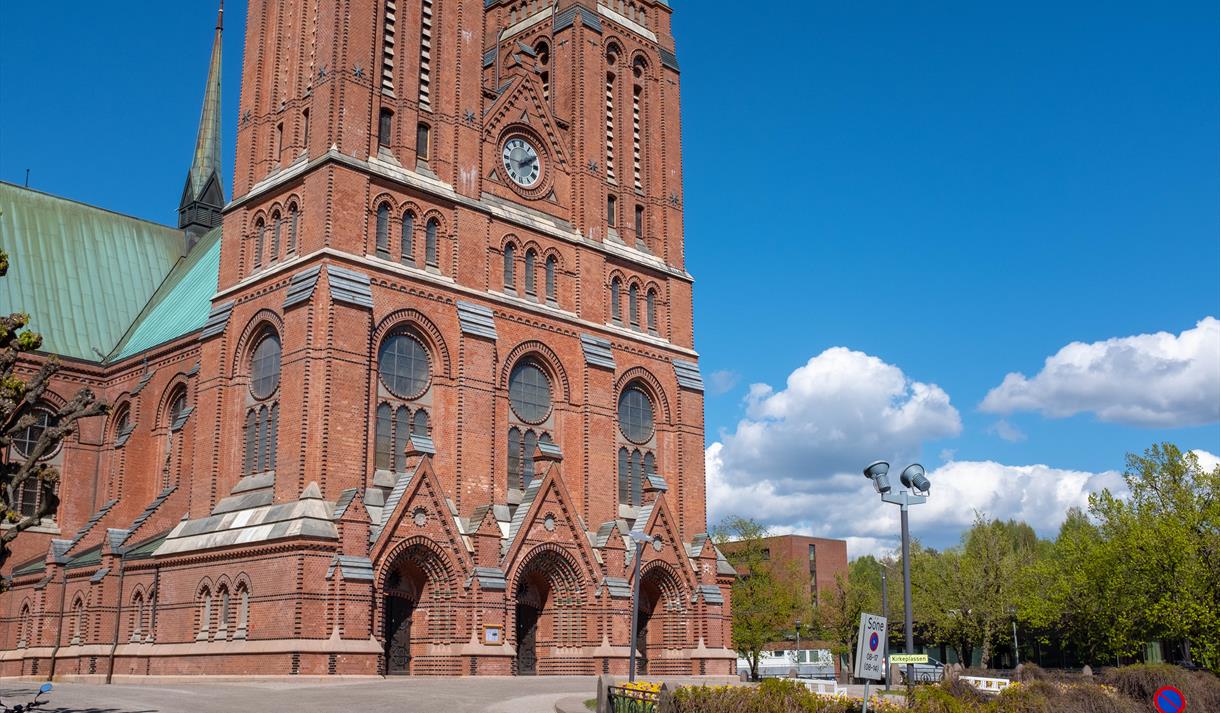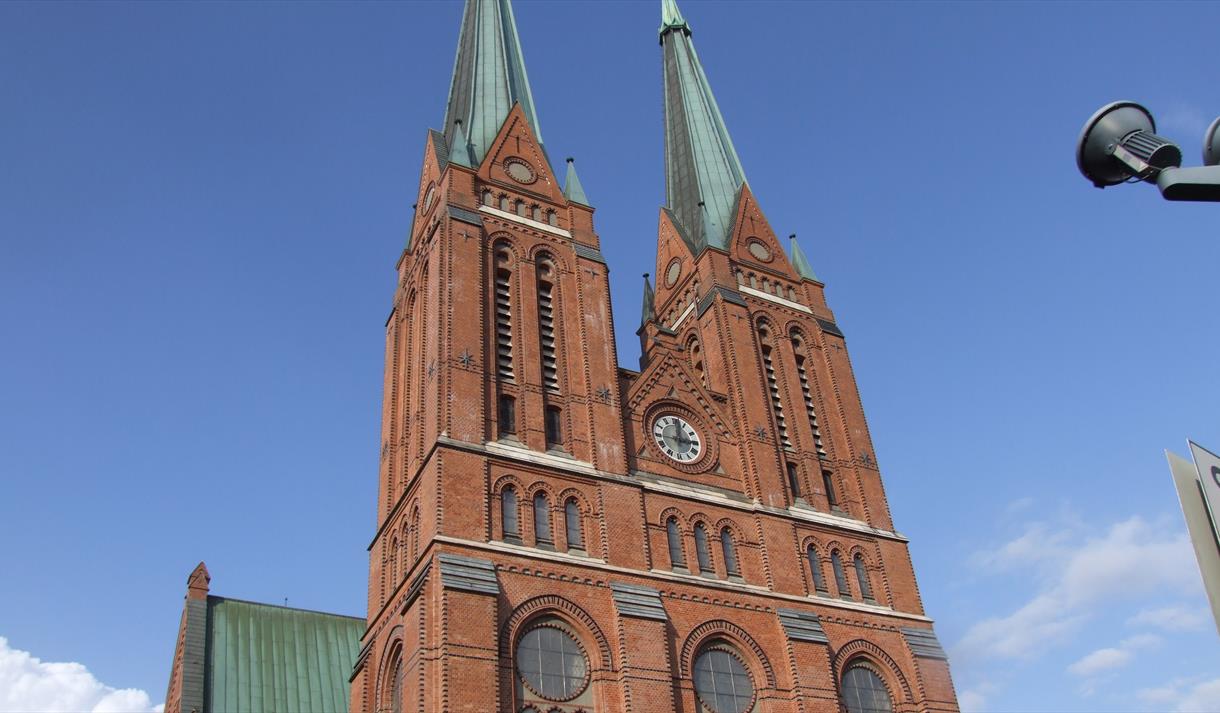 Skien kirke er i nygotisk stil og er vakkert utsmykket med glassmalerier og glasert stein. Kirken er korsformet, har tre portaler i hovedfasen, som en gotisk katedral. Den har to hovedtårn, og er kledt med rød teglsten med glasert tegl som markerer fasadebånd og bueslag. Kirken er hovedkirke i Skien prosti, er 47 meter lang og har to tårn på 68 meter, innvendig høyde er 17 meter. Den er tegnet av arkitekt Hagbarth Martin Schytte-Berg. Inspirasjon er hentet hos de tyske arkitektene Johannes Vollmer og Johannes Otzens. Kirken har fire klokker, to i hvert tårn. I begynneslen var det ringegutter i klokketauene hver morgen kl. 08, ved middag kl. 12 og hver kveld kl. 20. Ringingen fortsatte frem til etter 2. verdenskrig, og klokkene var med på å bestemme byens rytme.