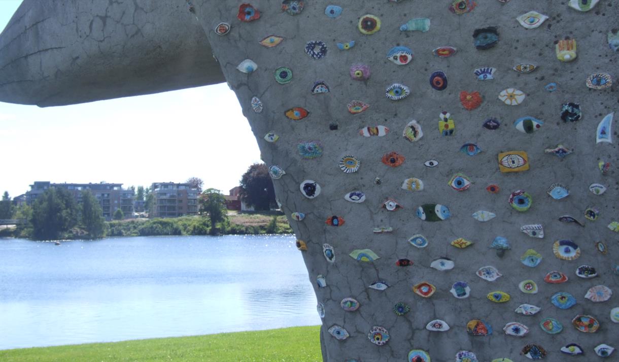 Skulpturen er laget av kunstneren Marit Benthe Norheim og 2349 elever fra Skiens skoler har smykket skulpturen med hvert sitt porselensøye som er støpt inn i den 7 meter høye skulpturen.