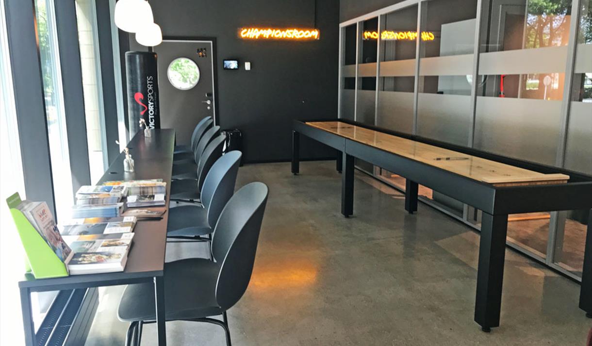 Hotellets lobby har døgnåpen barception (bar og resepsjon) og her kan du få kjøpt småretter, snacks, kaffe, øl og annet godt. I 1. etasje finner du også Champions League-rommet med stor TV-skjerm, som du kan booke å se ditt favorittlag kjempe om seieren.