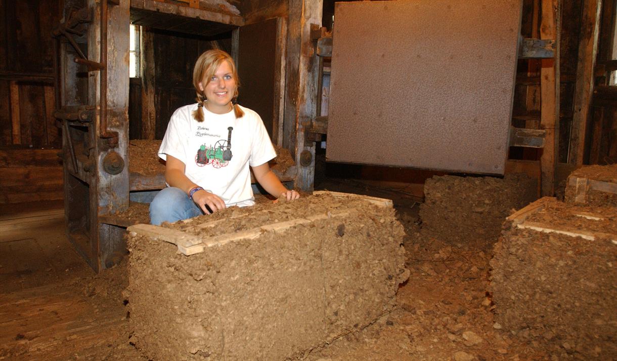 Prosessen fra torv i myra til ferdig torvstrøball demonstreres. Myhre Torvstrøfabrikk leverte i sin tid strøtorv til bruk i fjøs og stall og til påfyll i utedoer. Kristiania Renholdsverk var landets største forbruker.