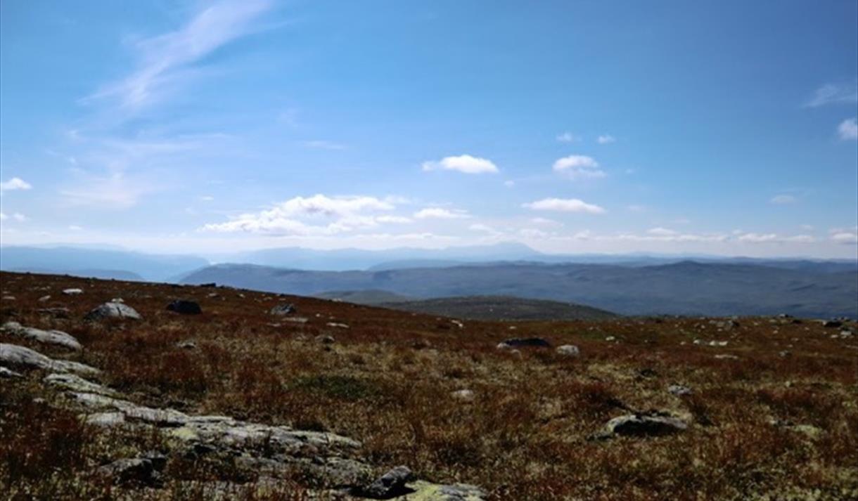 Når du kommer på toppen er det helt flatt og midt på står en varde. Fra toppen kan du i klart vær se til Lufsjå, Hårteigen, Hallingskarvet og Gaustatoppen.