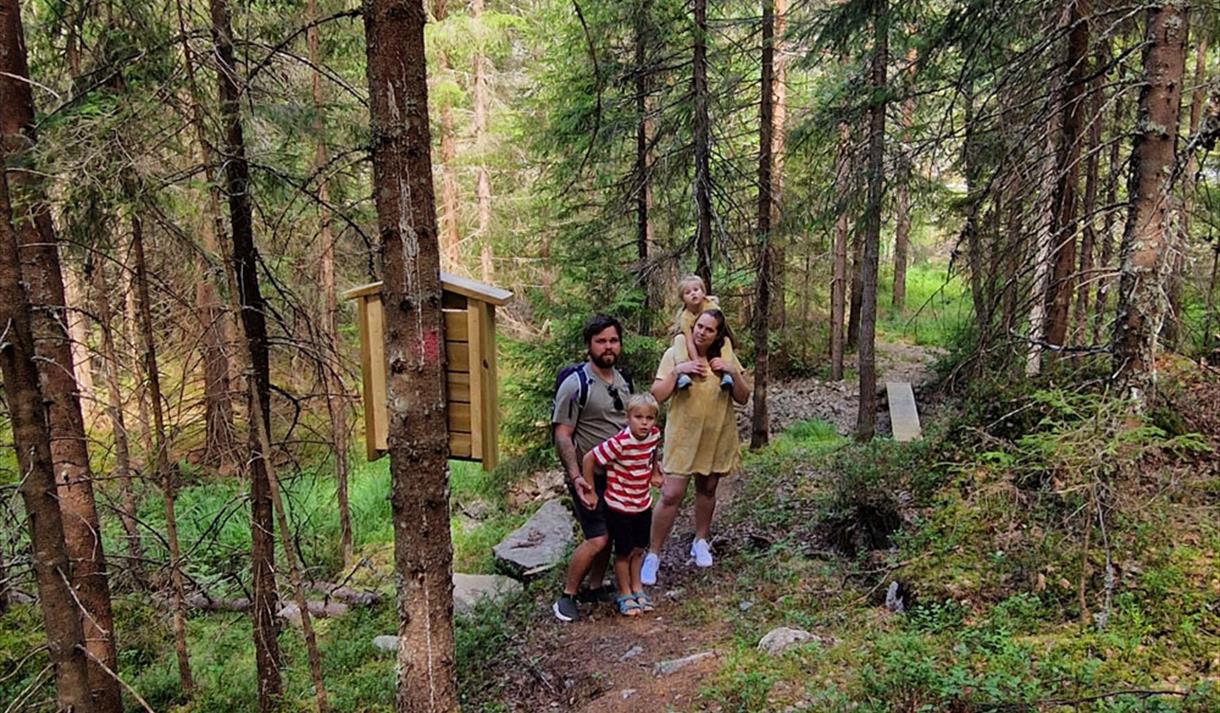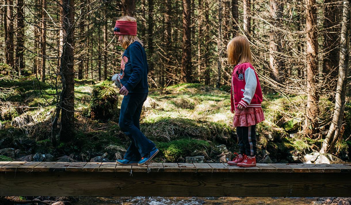 Eventyrstien er 500 meter lang og byr på en variert vandring gjennom furuskog, langs bekker og over myrer (historisk tømmerled).