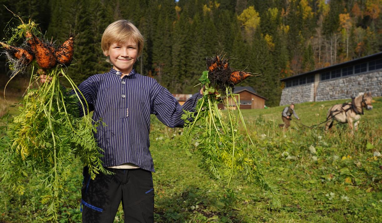 I løpet av sommaren kan du oppleve forskjellige aktivitetar ute på jordet eller ved husmannsplassen. Hesten vert bruka flittig mellom anna til pløying og framkøyring av tømmer.