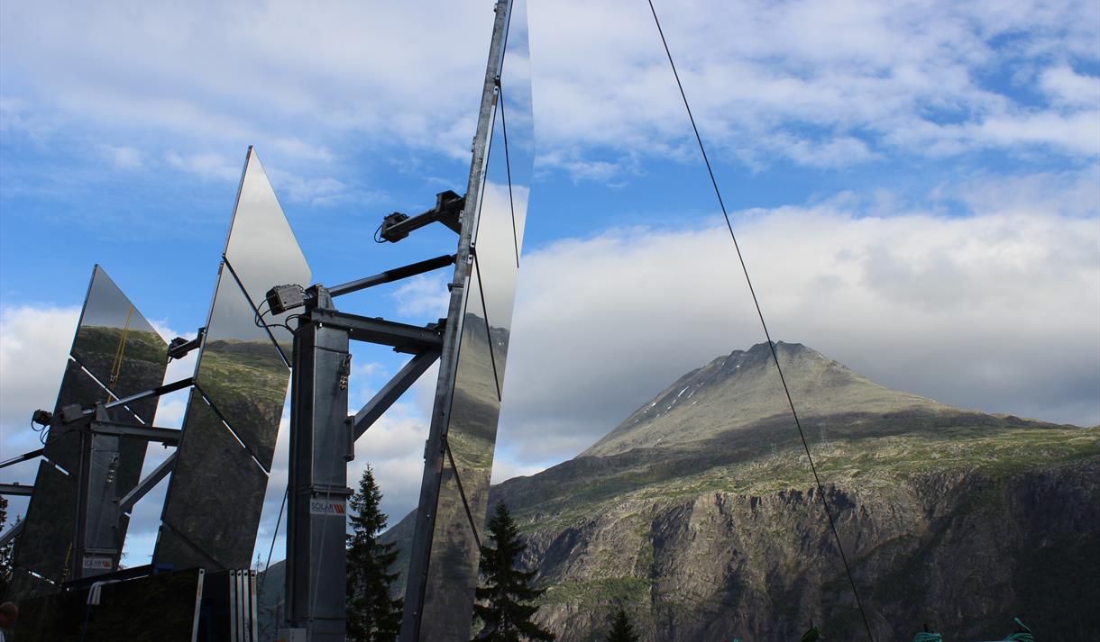 De 3 heliostatene består av datastyrte speil som følger solens gang over horisonten og reflekterer solstrålene ned på Rjukan Torg.