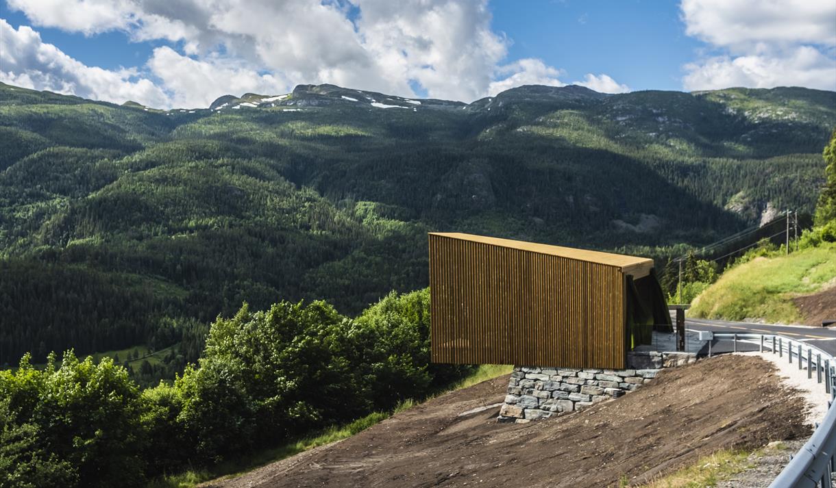 Det vesle utsiktsbygget som nå har kome her, rammar inn den vakre utsikten. Opplevinga av å gå ut på utstikkaren gjennom ei ramme som endrar seg frå liggande til ståande, synleggjer dramatikken i landskapet med den flate, grøne dalbotnen og den bratte, blå Skorveveggen på ein ny måte. På andre sida av vegen er det lagt til rette for parkering både med bil og sykkel, og eit lite toalettbygg har kome opp. På veggen der finn de kart og informasjon som viser sykkelruter og stoppestadar. Bekken som kjem ned frå berget bakom har fått eit mura utløp der trøtte syklistar kan bade føtar.