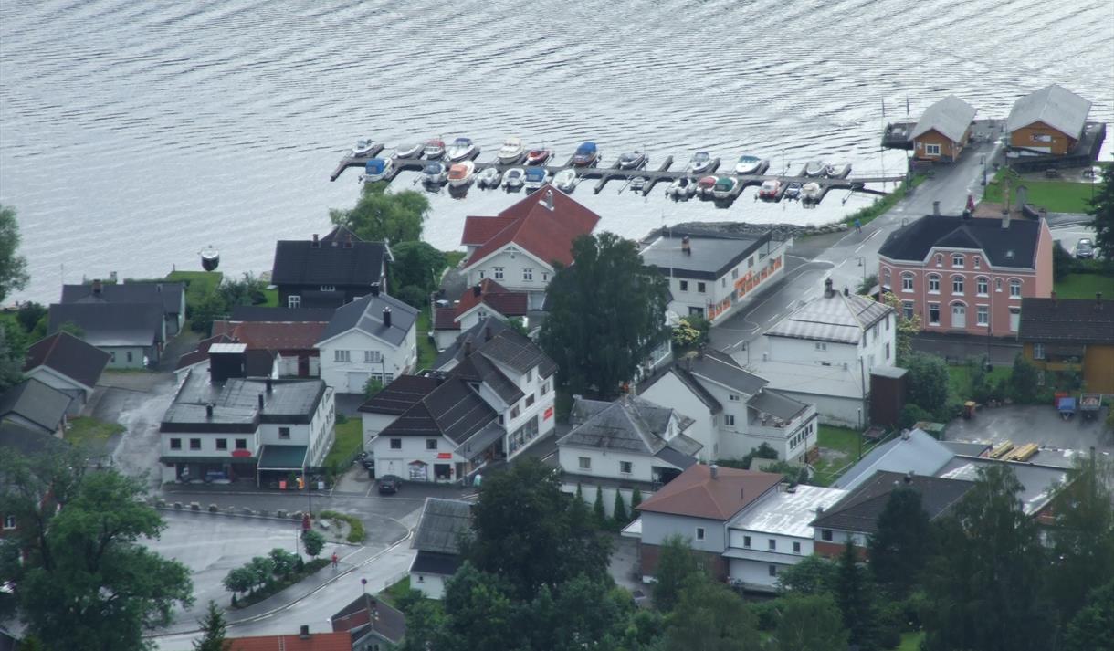 Frå RV 41 ta av mot Kviteseidbyen og Kanalbåtane. Brygga ligg i enden av Kviteseidgata ved Telemarkskanalen.