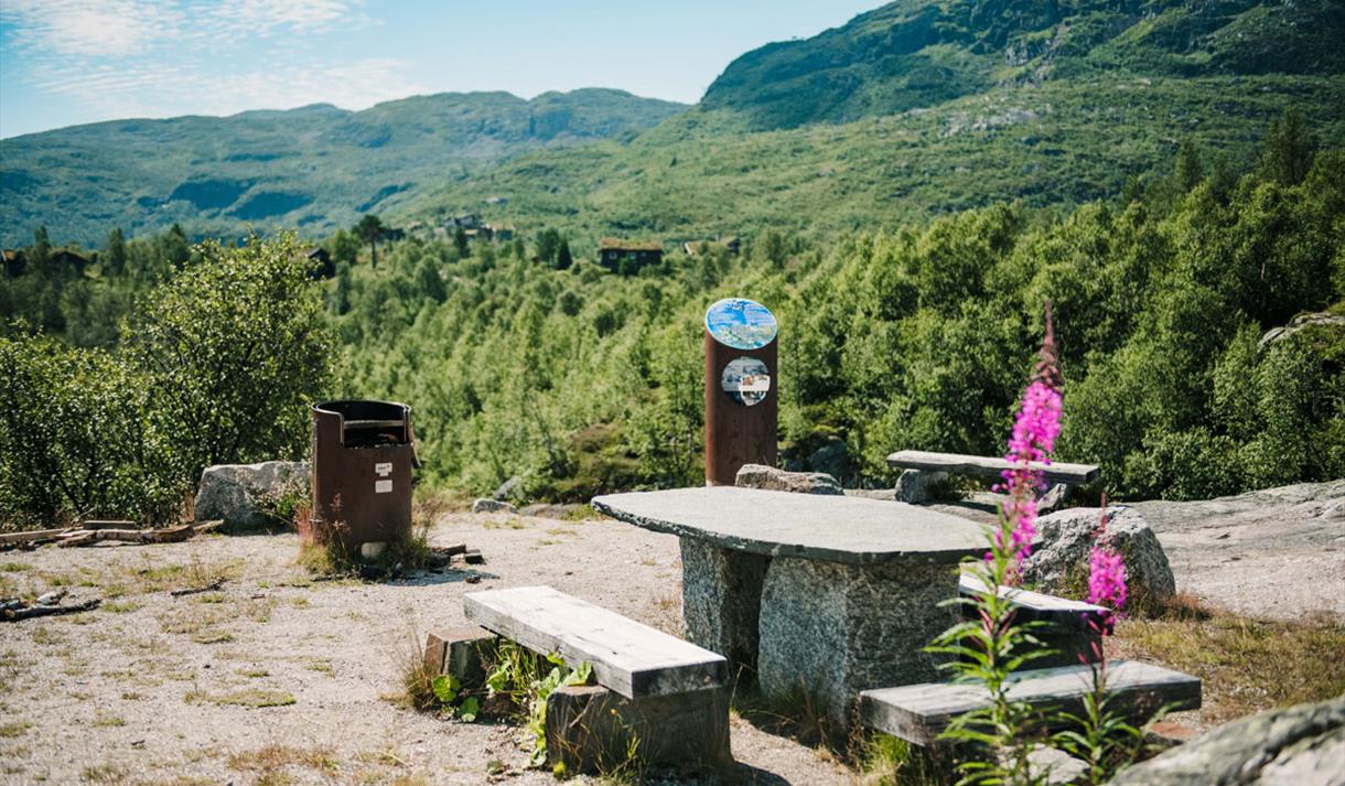 Turen starter ved Arbuvollen og går langs veien vest for den gamle fjellbutikken. Turveien er skiltet fra parkeringsplassen, og hele runden kan tas med barnevogn.